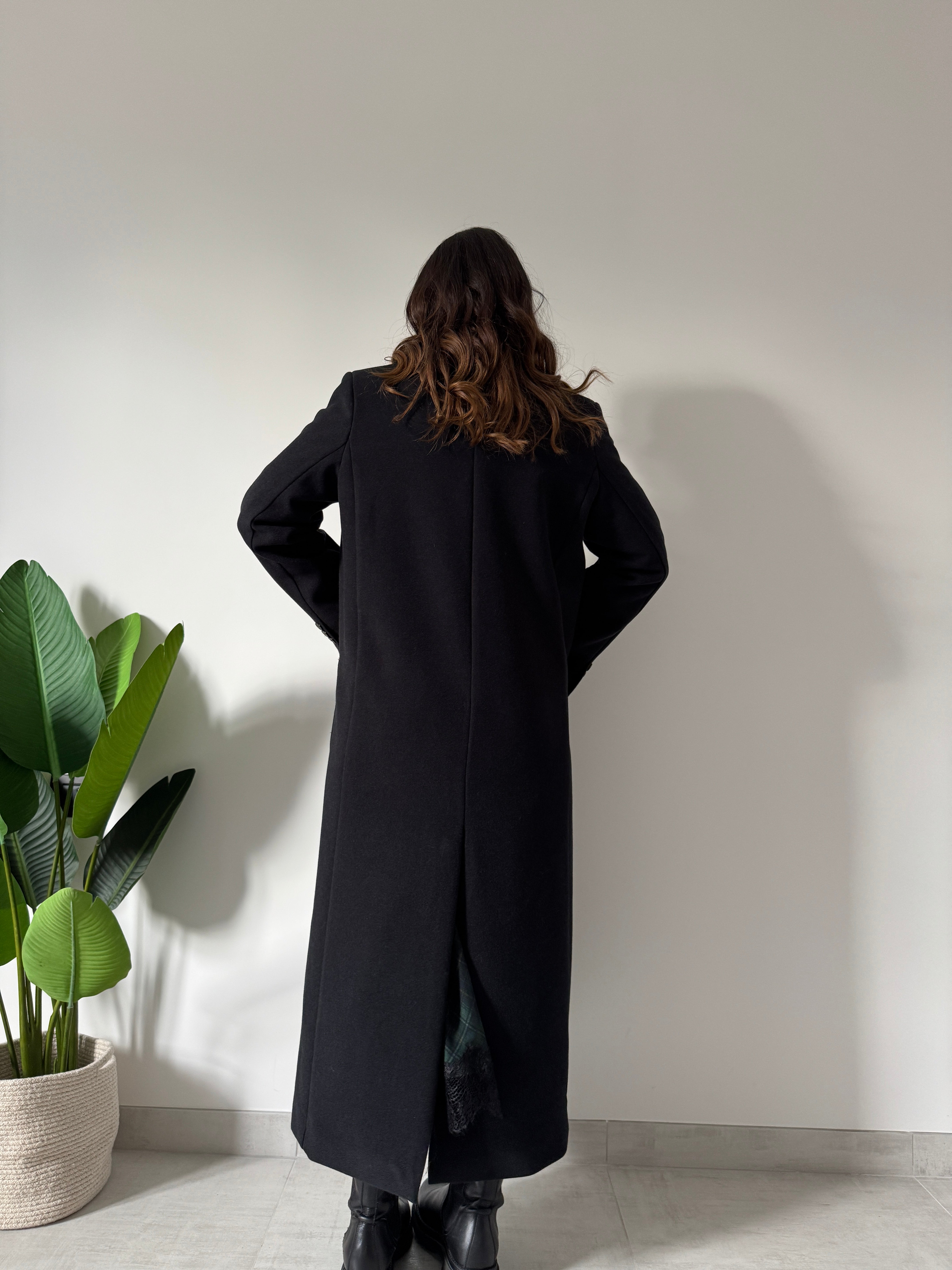 Cappotto lungo firmato casa Lumina con tasche laterali, bottoni di chiusura centrali, spalline interne, spacco sul retro e piccola applicazione con logo "LUMINA" sul polso. Unica variante colore