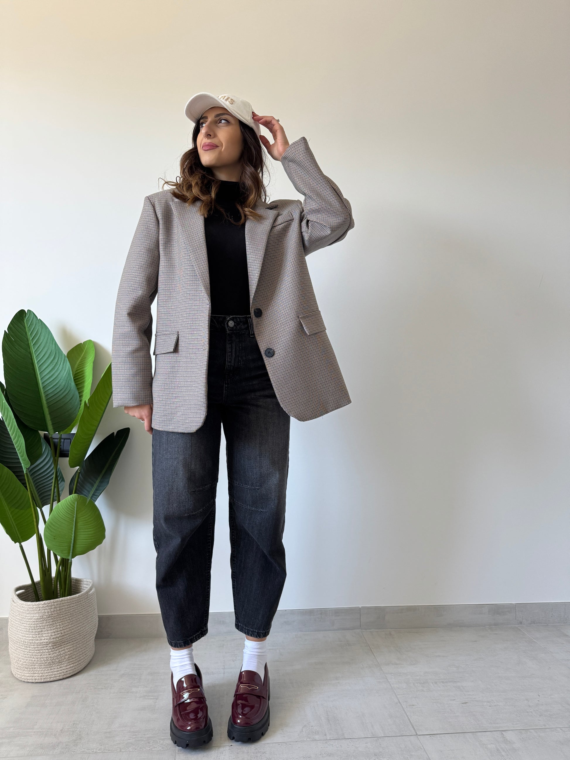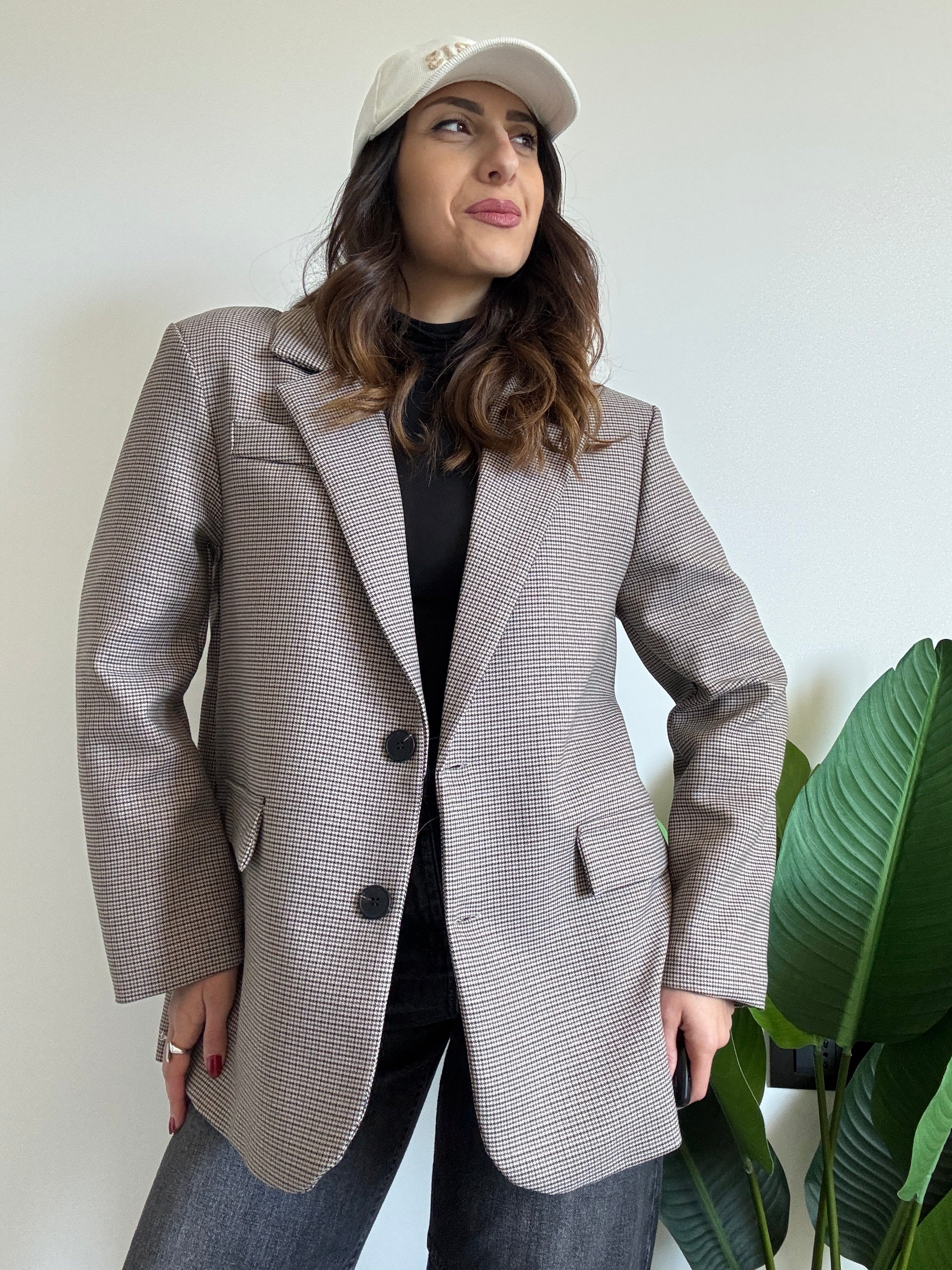 Giacca over a fantasia, spalline interne, doppio bottone centrale di chiusura e tasche a filo laterali. Unica variante colore.