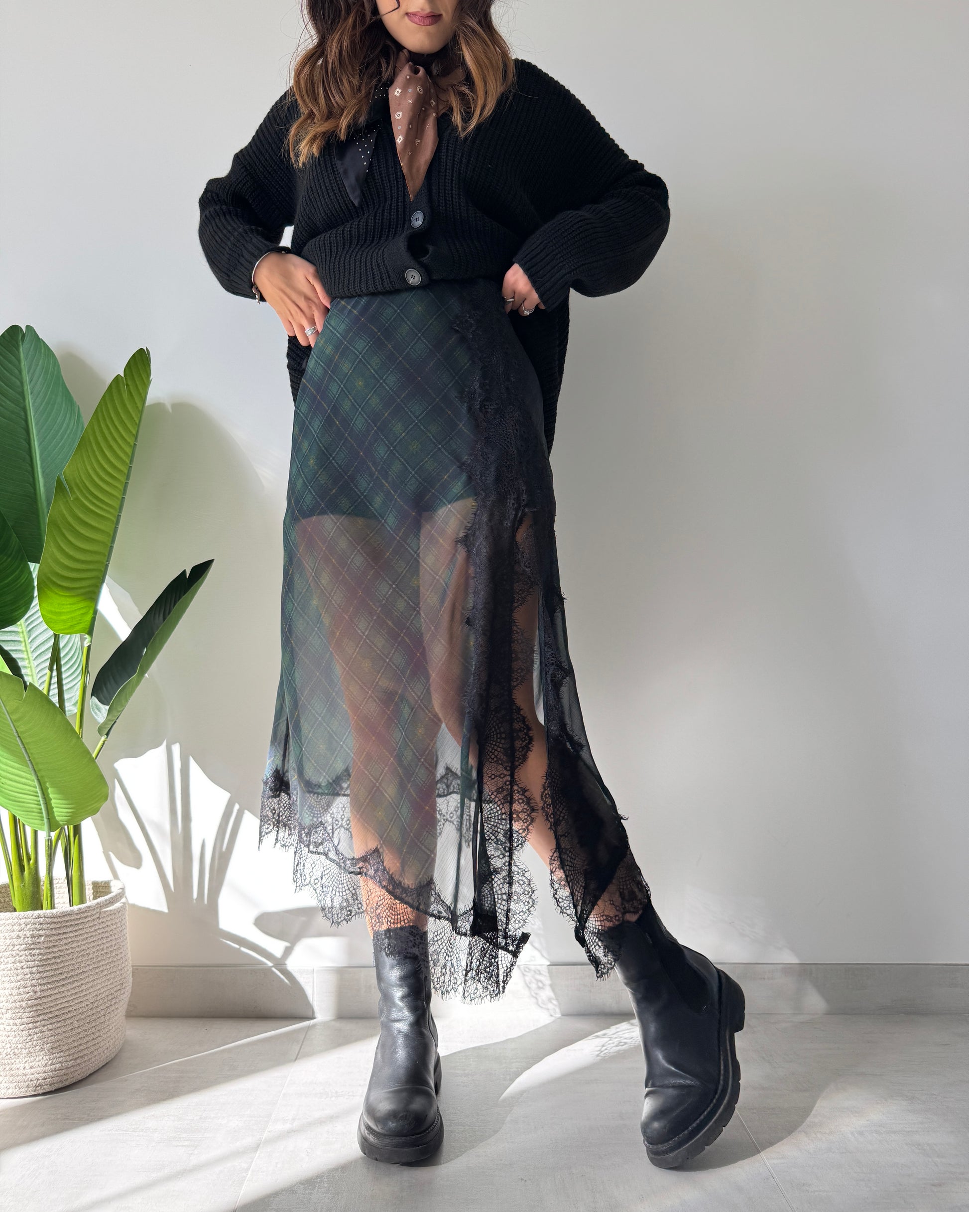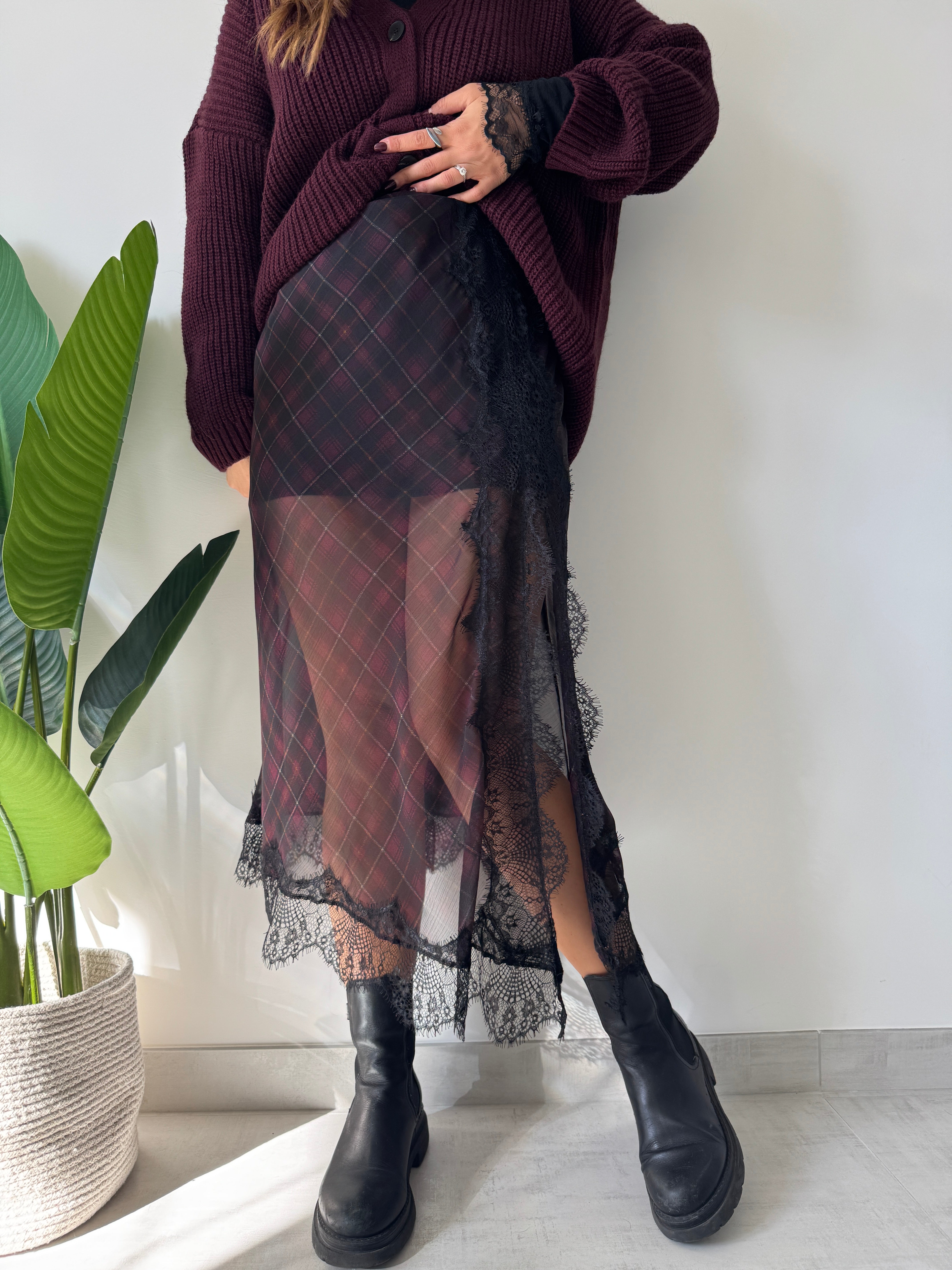 Gonna in pizzo firmata casa Lumina con elastico suk punto vita, fodera interna, spacco laterale con pizzo a contrasto.