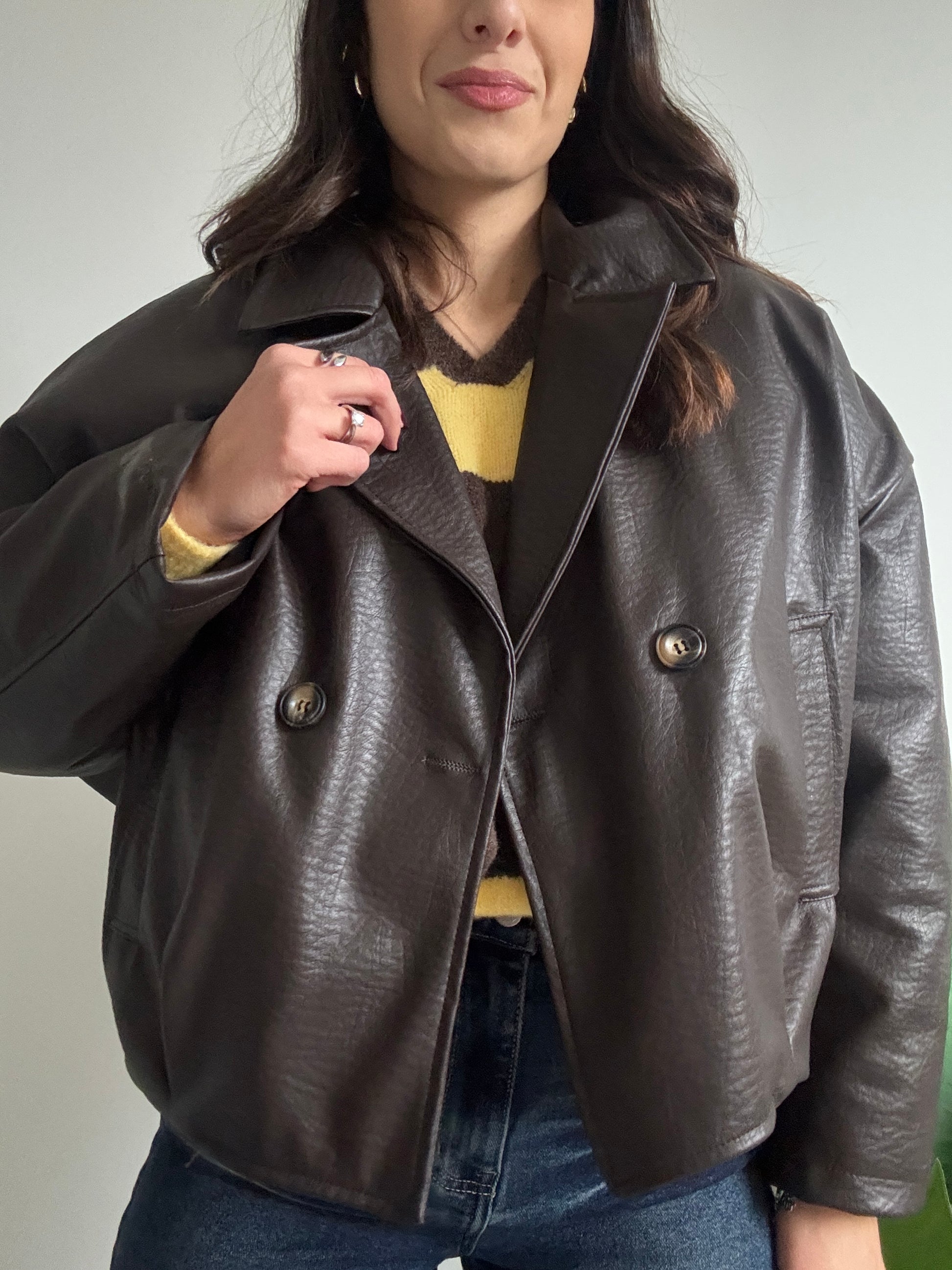 Bomber in ecopelle trapuntato all'interno con bottoni centrali, tasche laterali, effetto martellato. Unica variante colore,