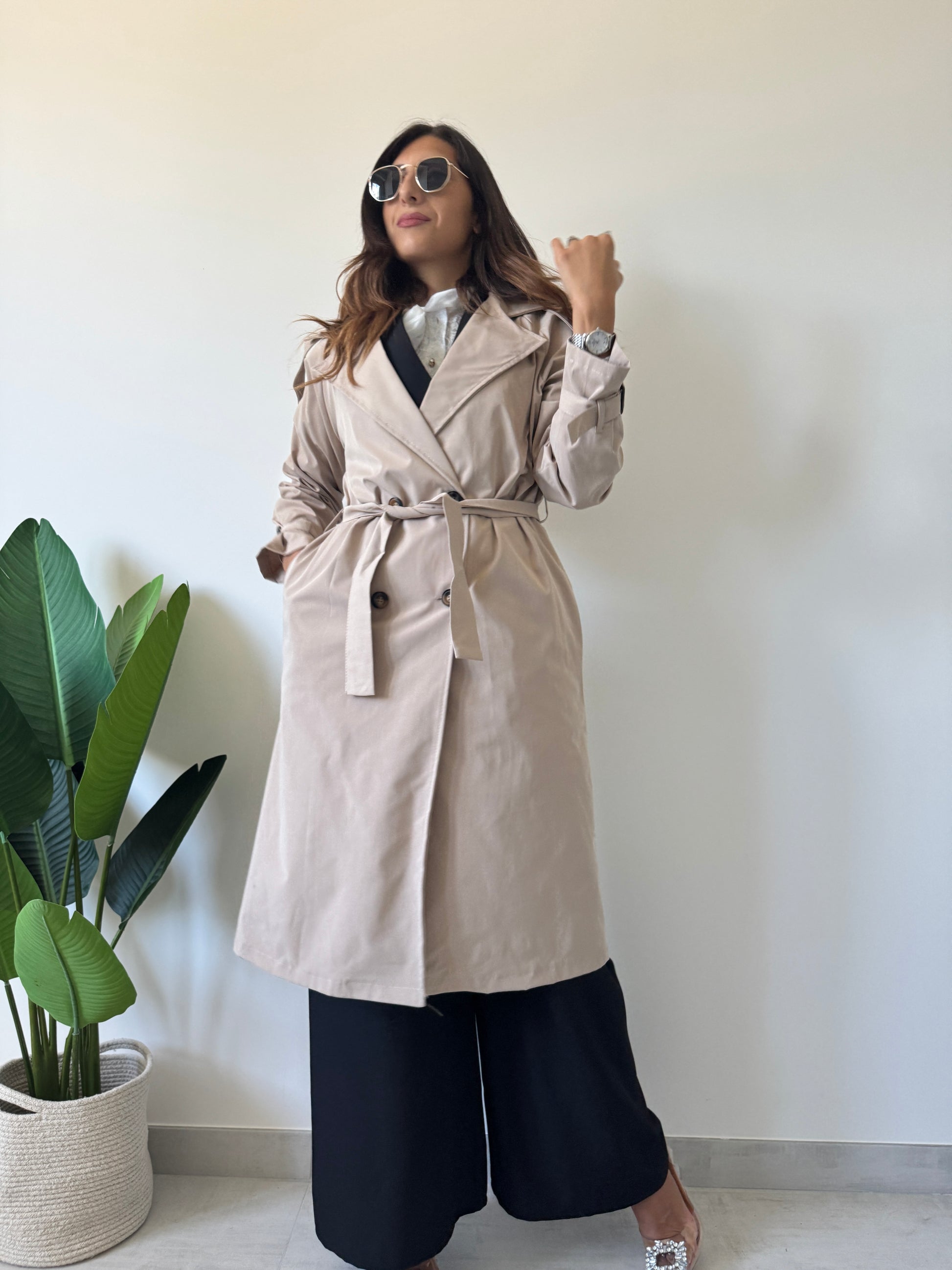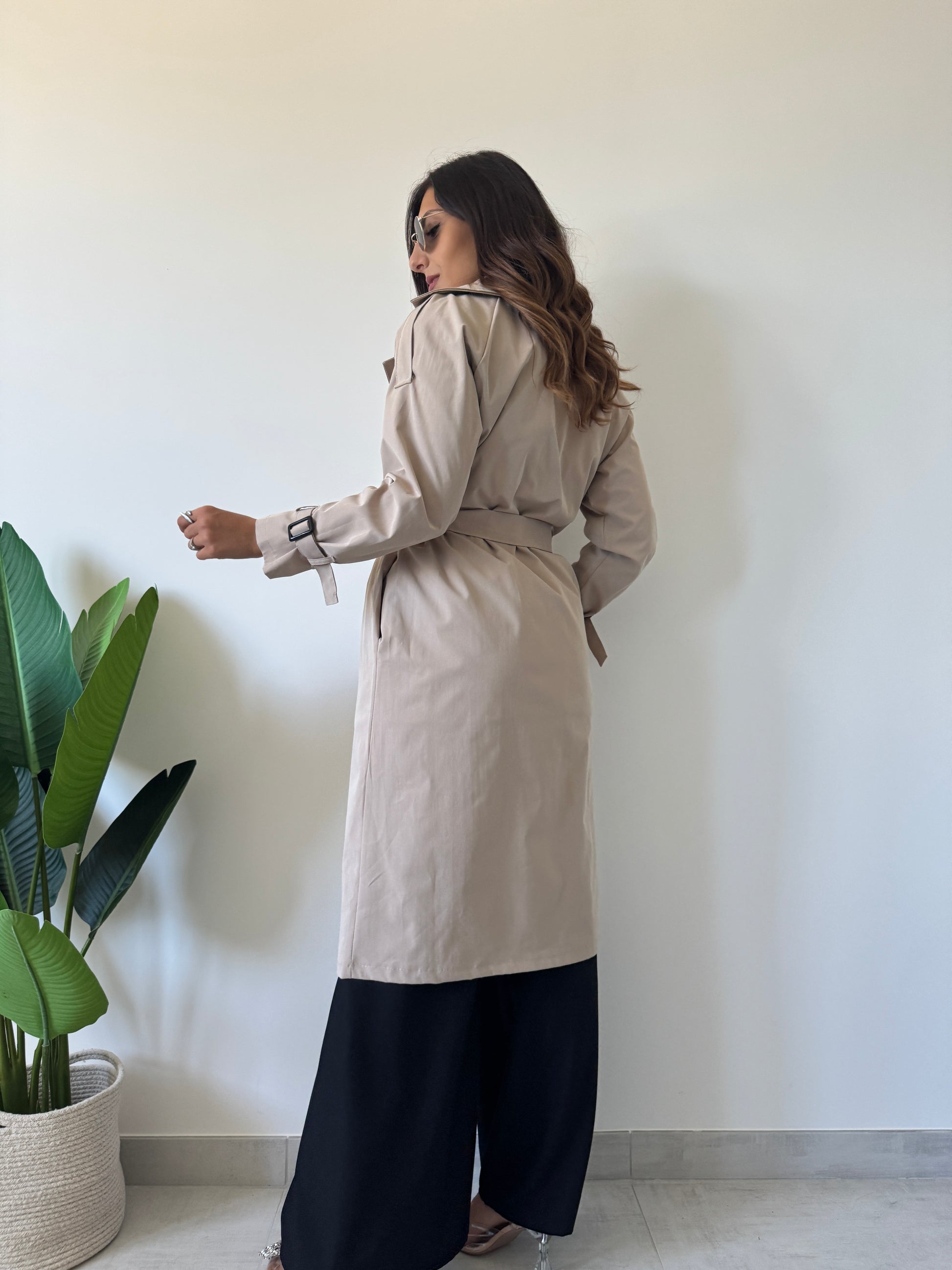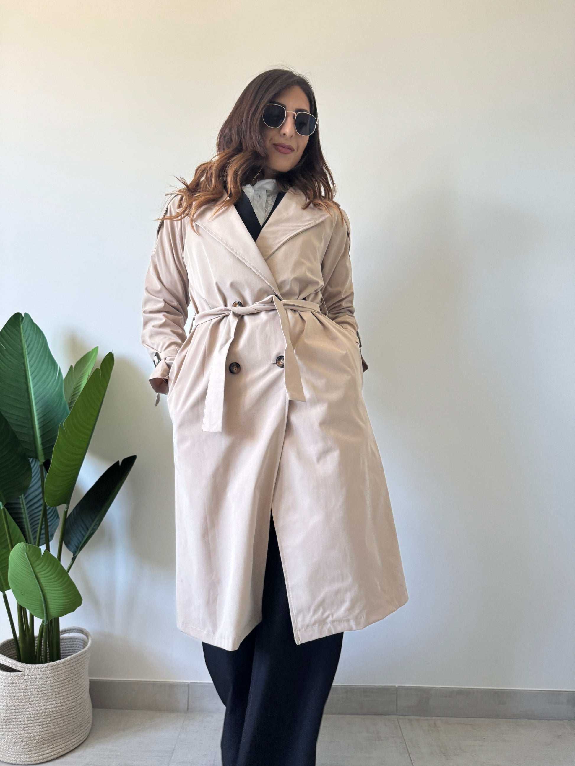 Trench con bottoni centrali di chiusura, polsini regolabili, tasche laterali e fusciacca sul punto vita. Variante colore crema.