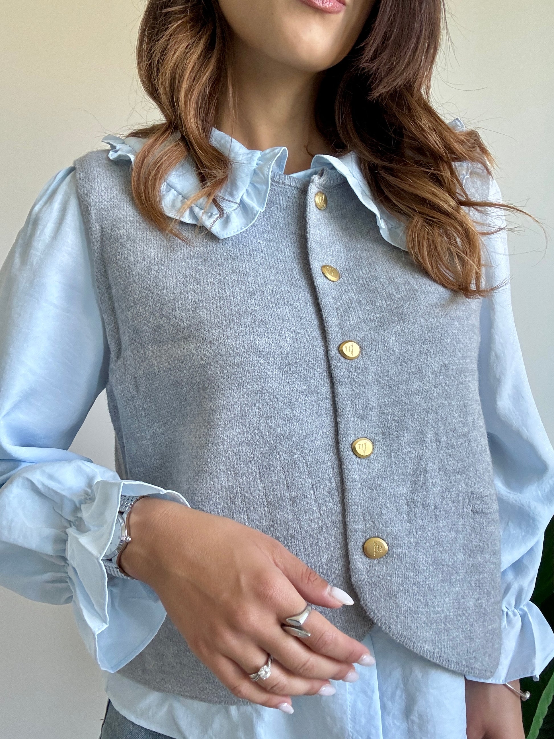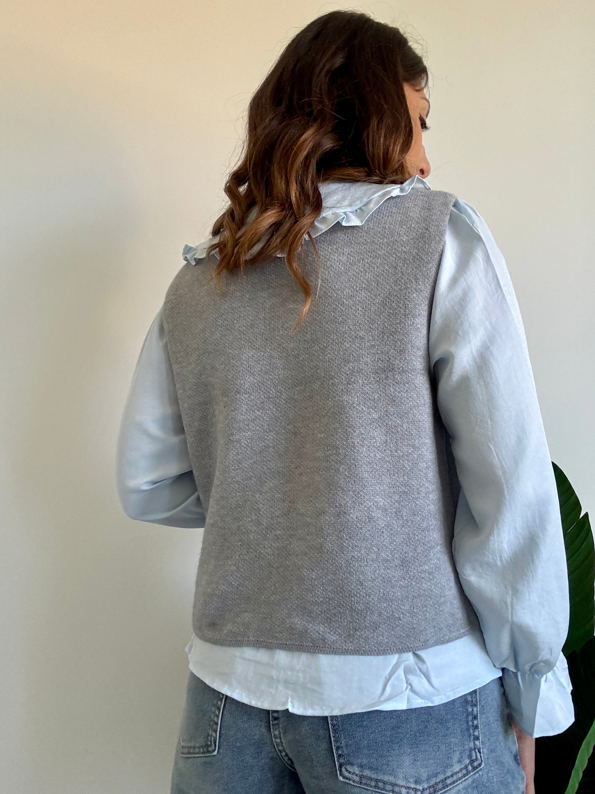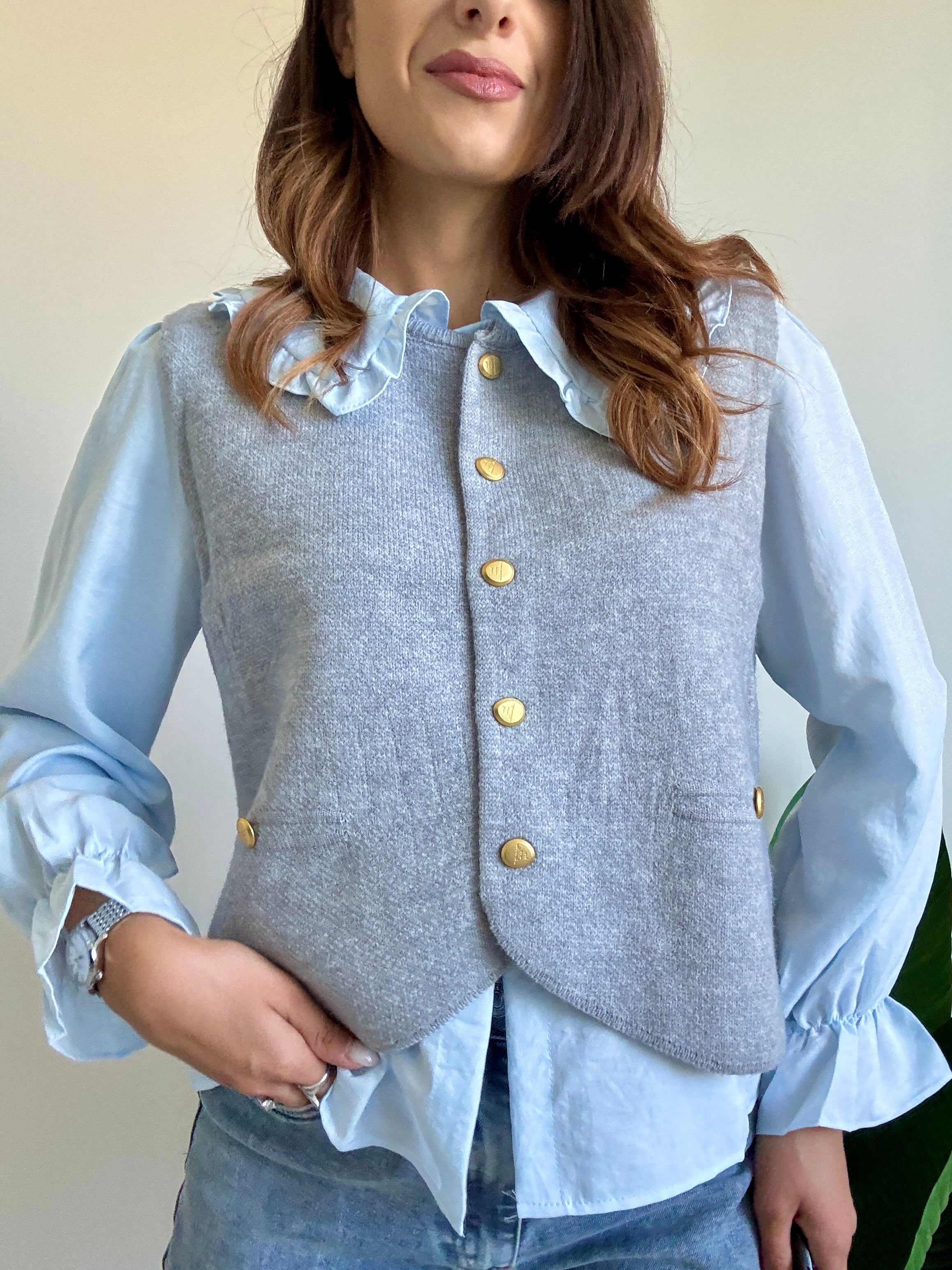 Coordinato college con camicia celeste con bottoni, colletto e maniche con elastico. Gilet grigio con bottoni oro.