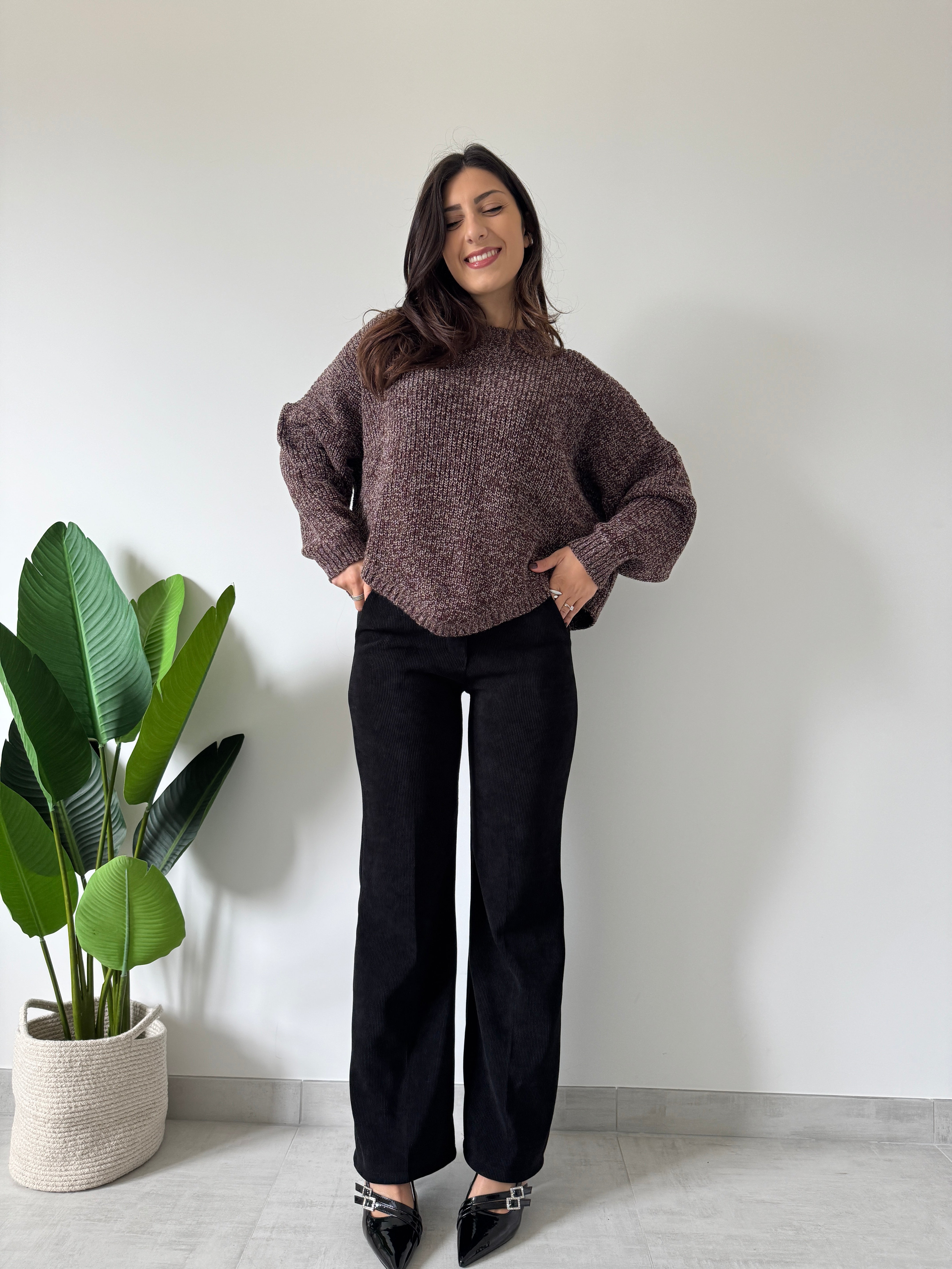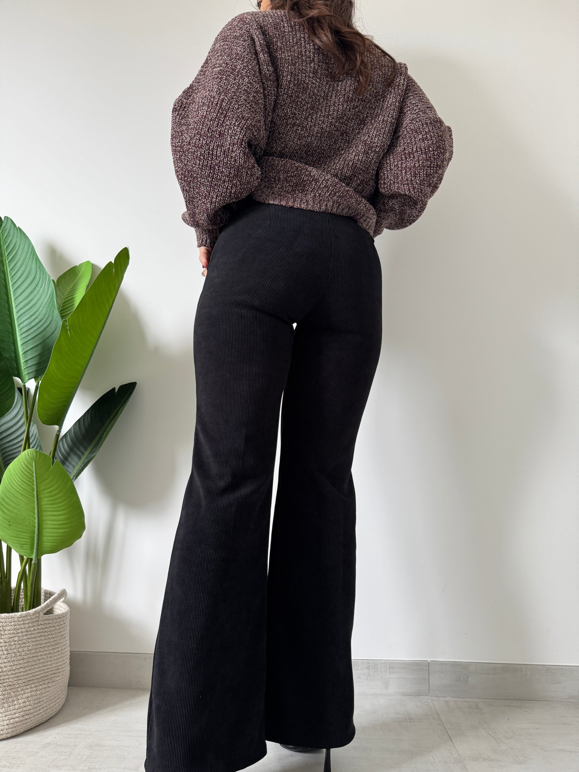 Pantalone a zampetta in velluto, bottone centrale di chiusura, zip, passanti, tasche laterali. Vita regular.