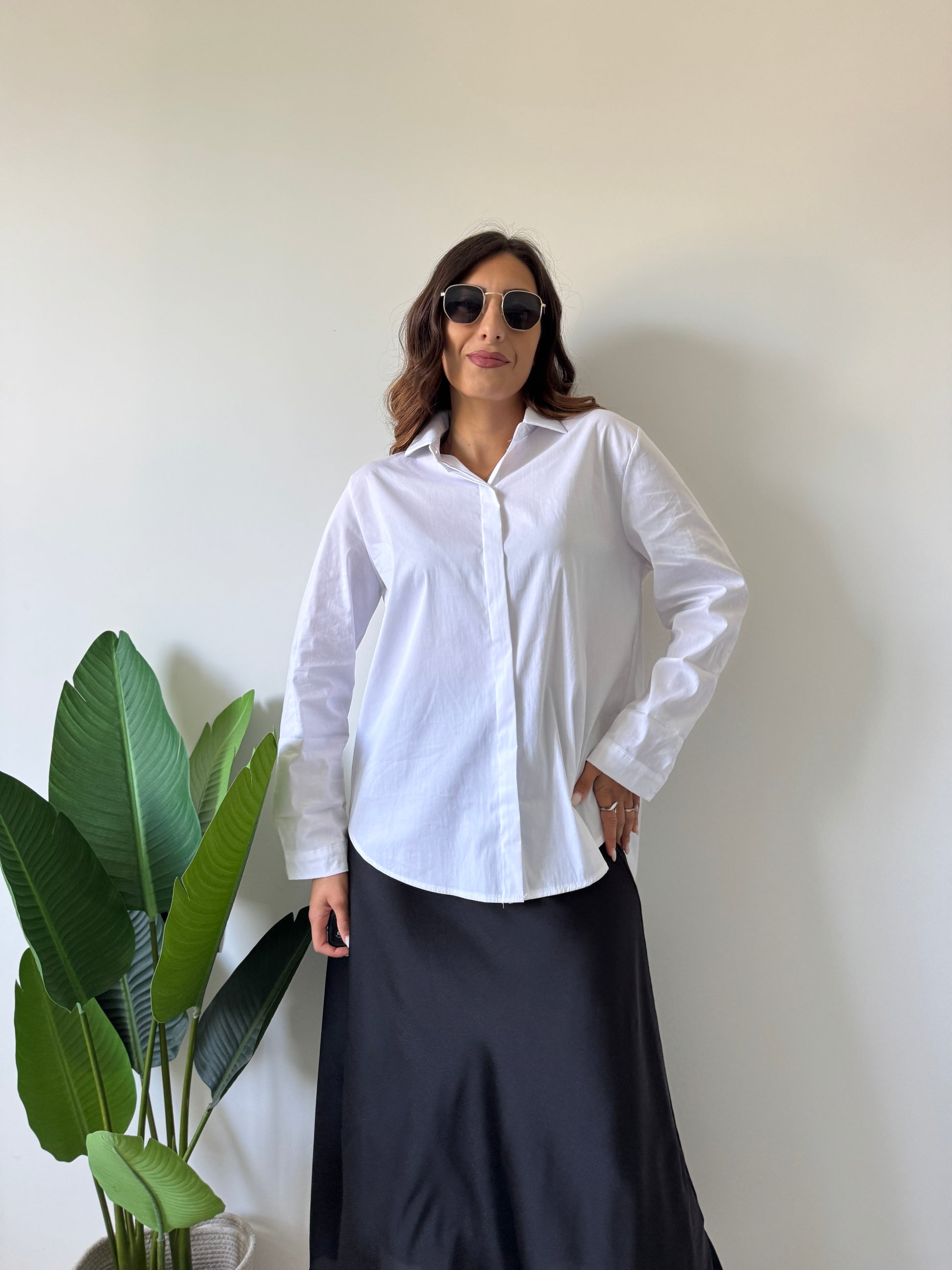 Camicione in cotone over con colletto, bottoni centrali, polsini e parte dietro più lunga. Unica variante colore.