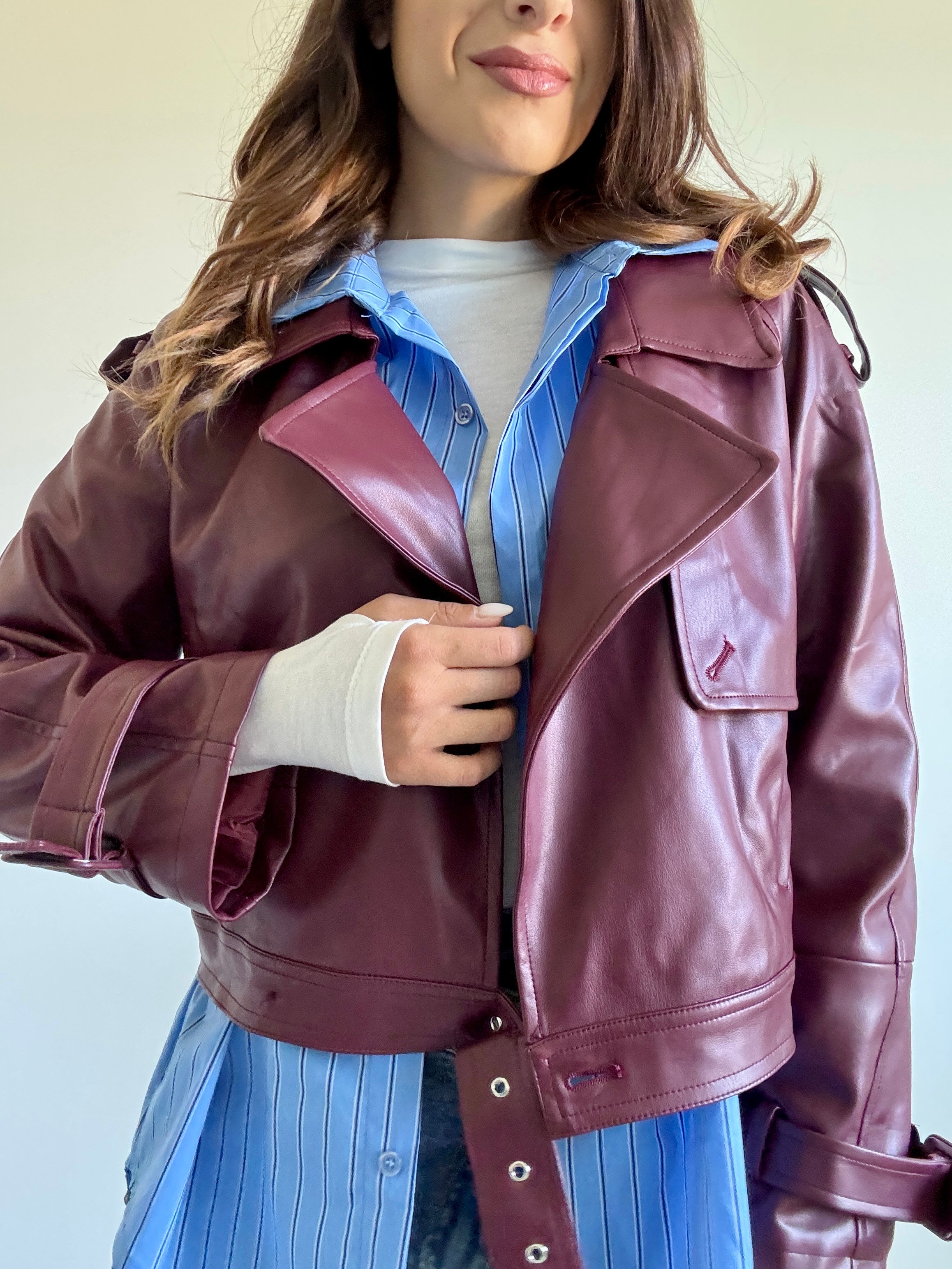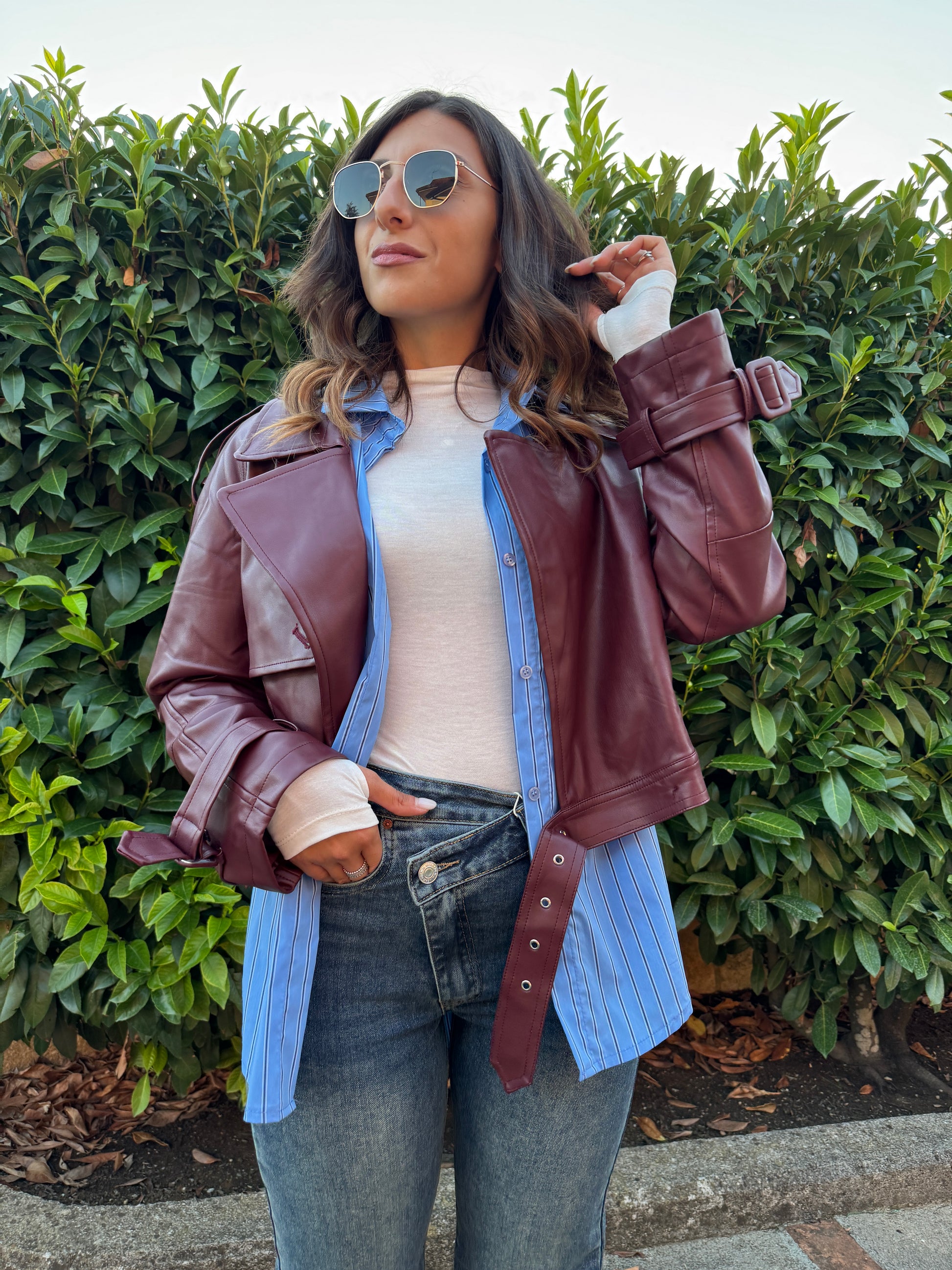Chiodo Rica in ecopelle con polsini regolabili, bottone di chiusura e cinturino. Variante colore borgogna.