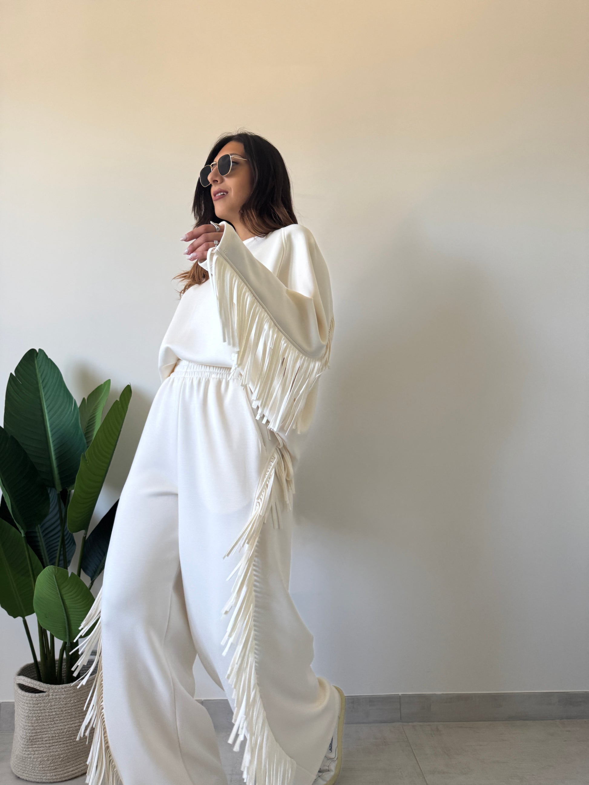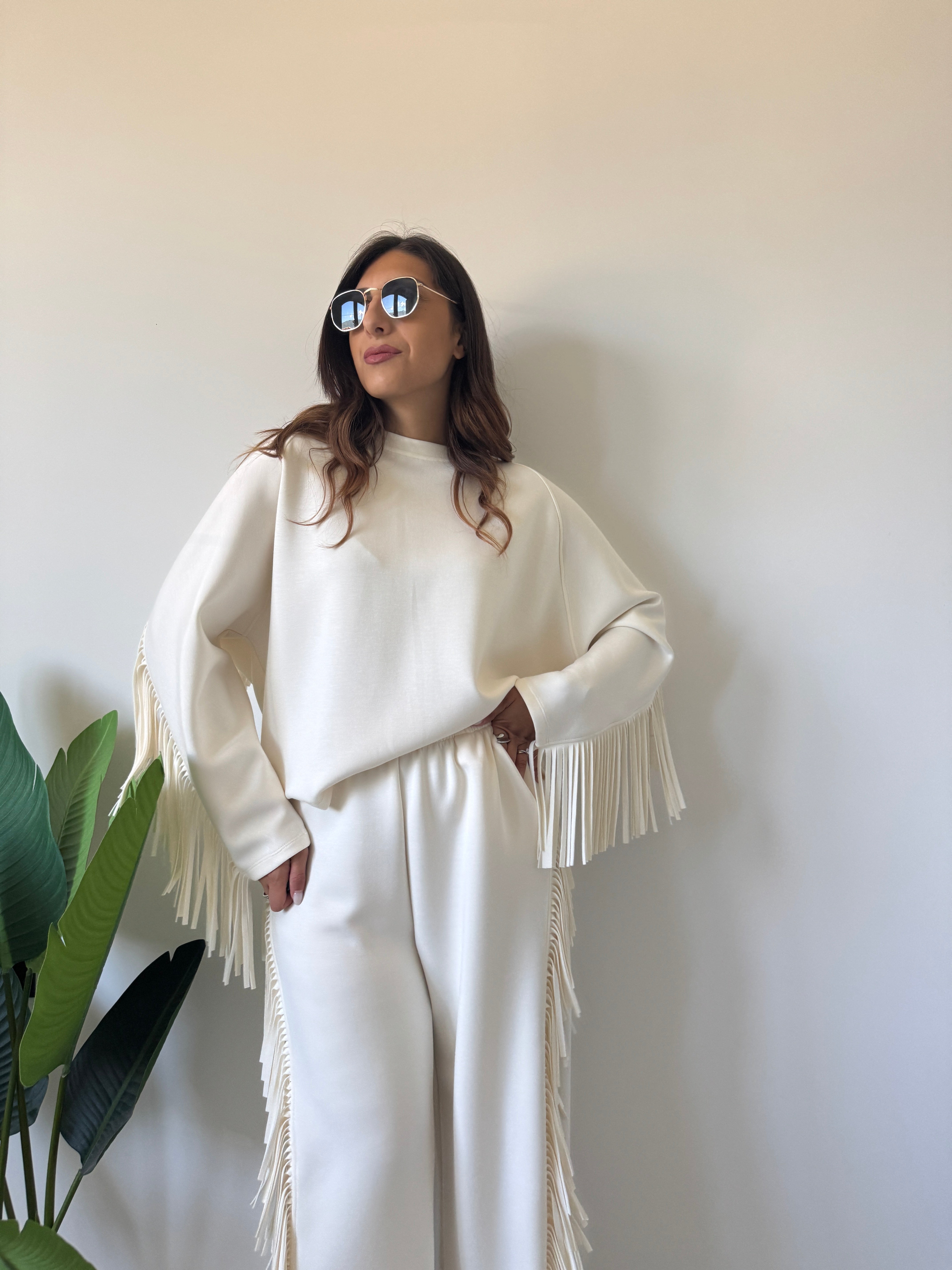 Felpa over con collo a giro e frange dietro la schiena e lungo le maniche. Variante colore panna.