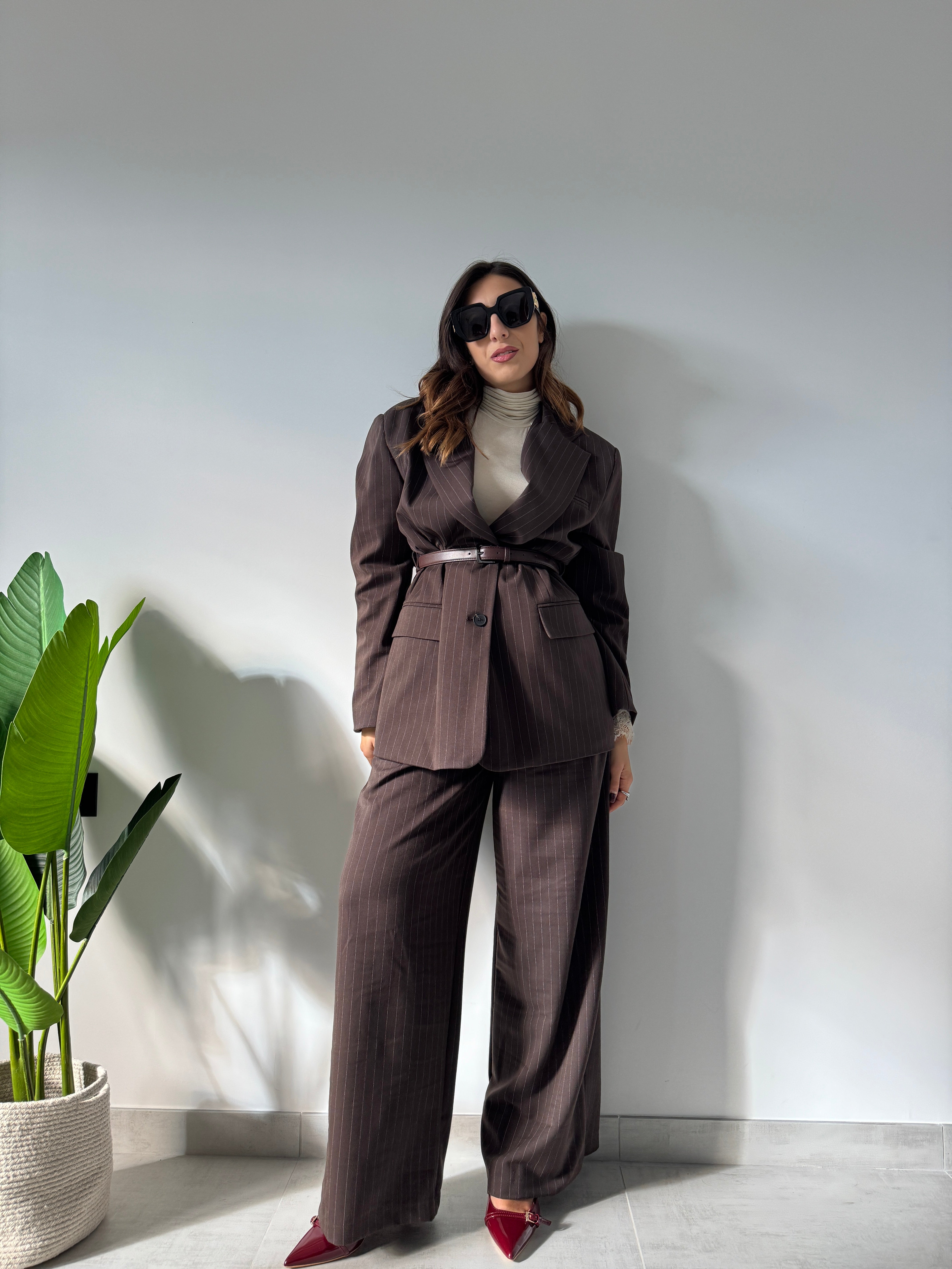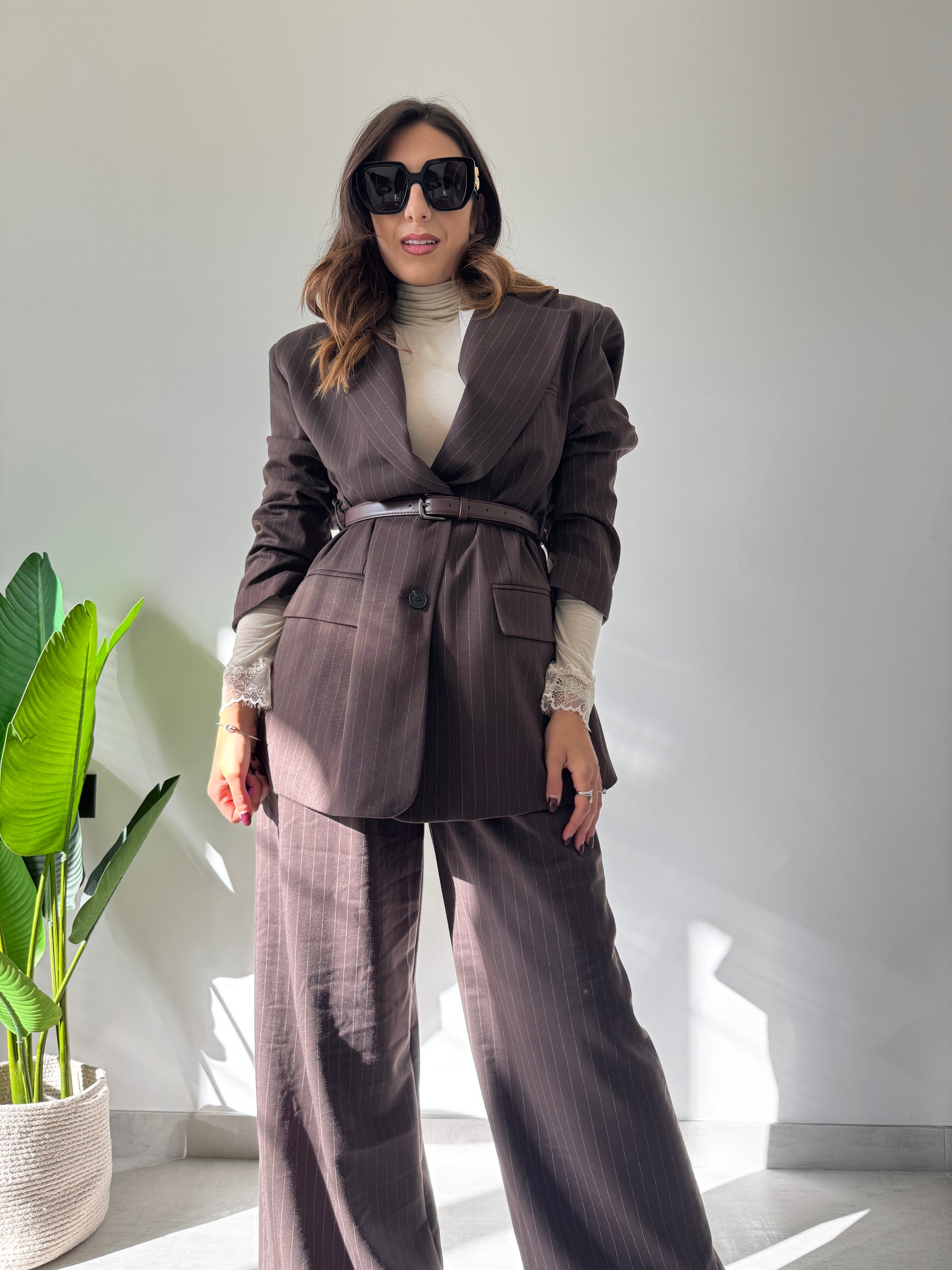 Giacca modello over firmata casa Lumina con spalline interne, bottoni centrali di chiusura, cinturino sul punto vita incorporato nella variante cioccolato e taschino a filo laterale.