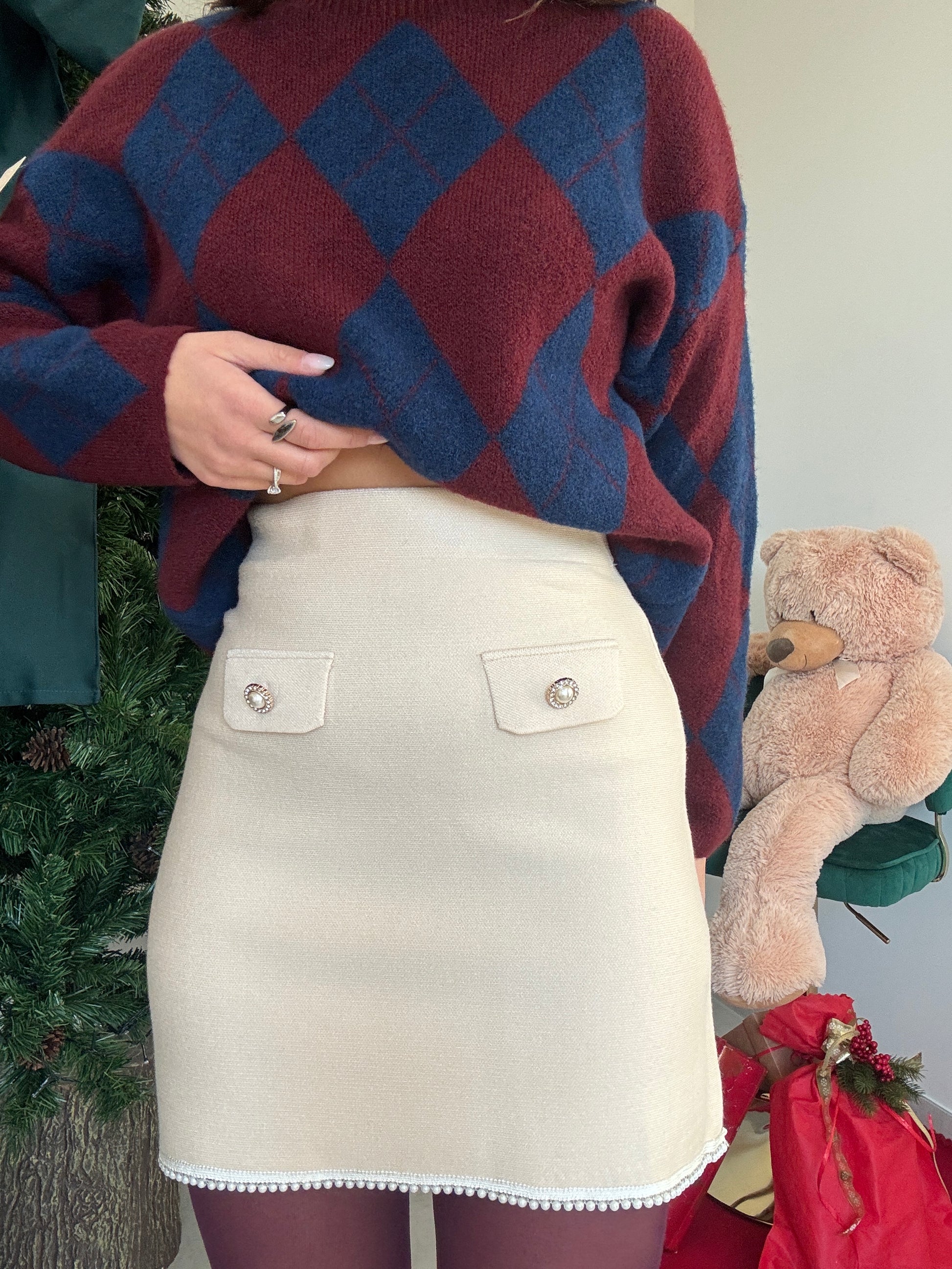 Gonnellina elasticizzata con elastico sul punto vita, bottoni centrali gioiello e perle nella parte finale. Unica variante colore.