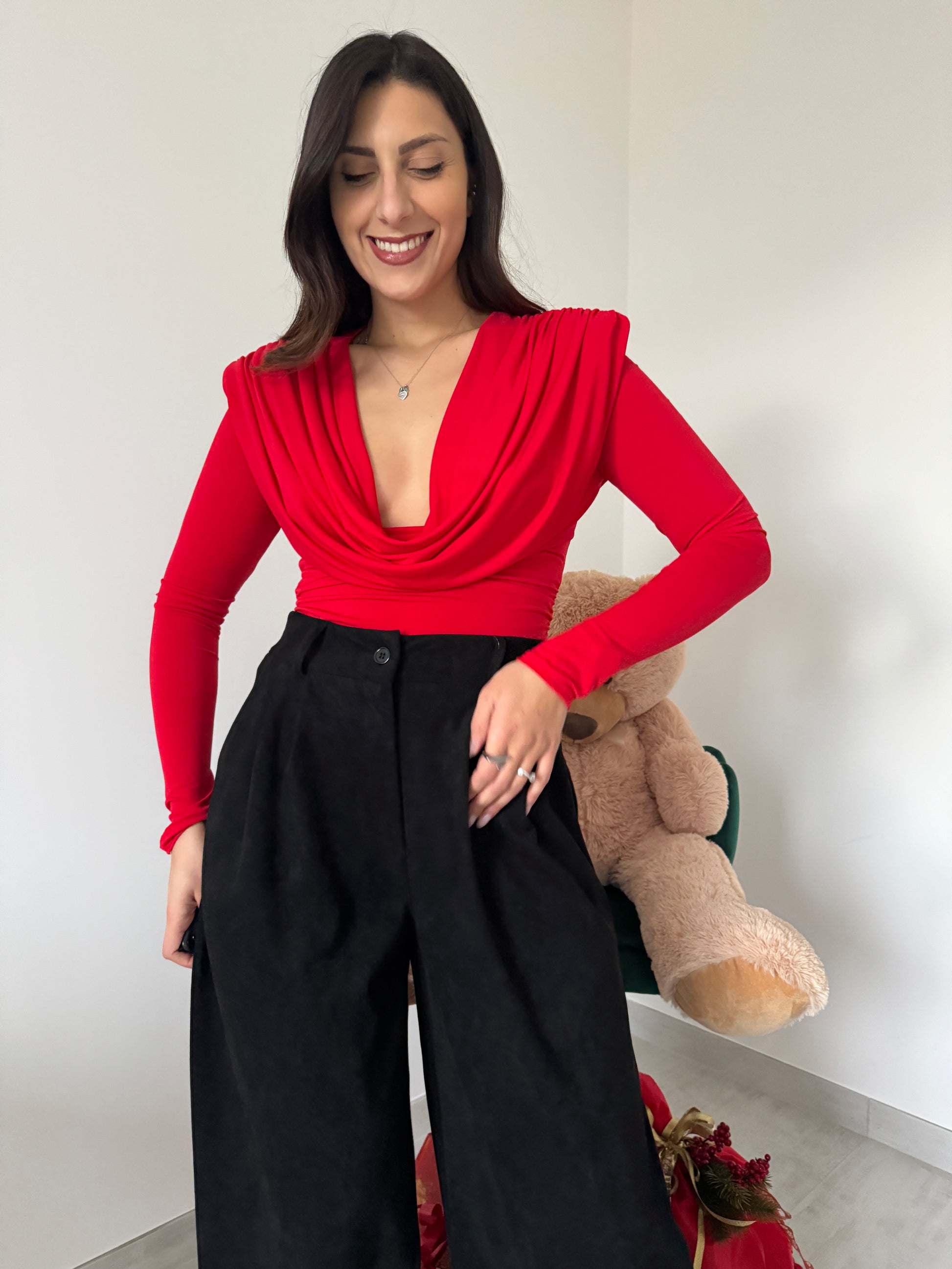 Maglia elasticizzata con spalline interne, manica lunga e scollo sciallato.
