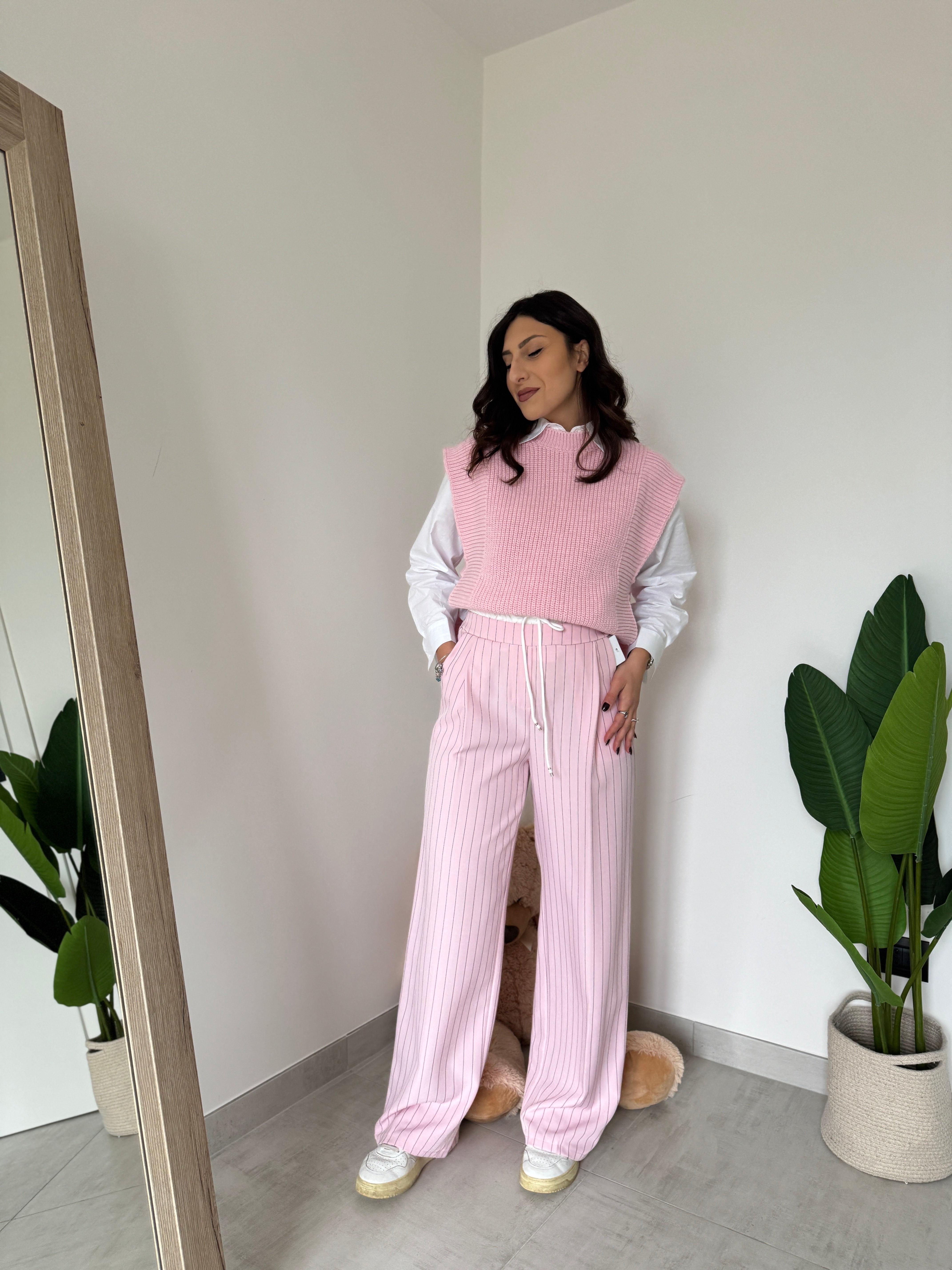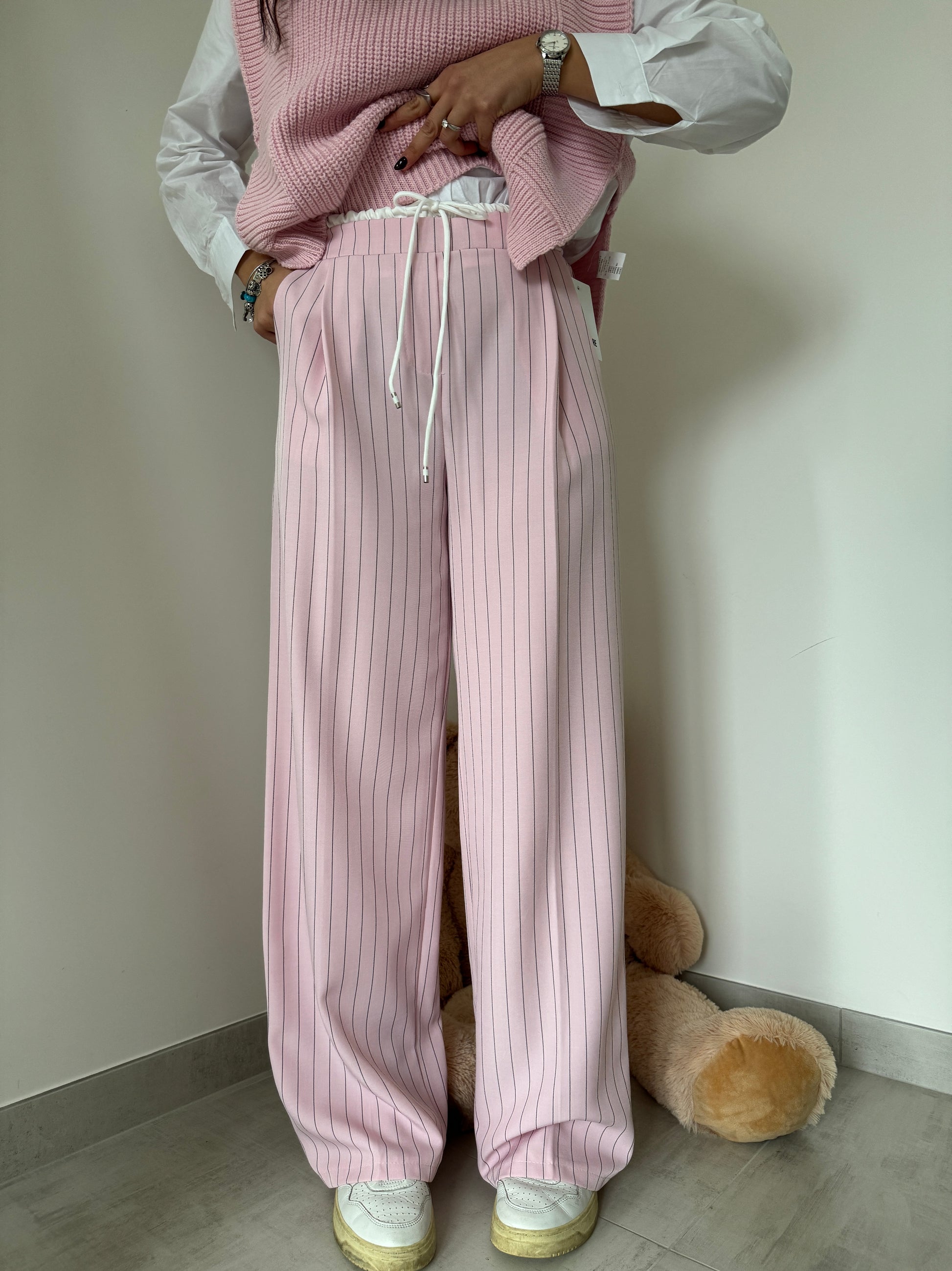 Pantalone gessato con gamba dritta, laccio, elastico a contrasto sul punto vita e tasche laterali.