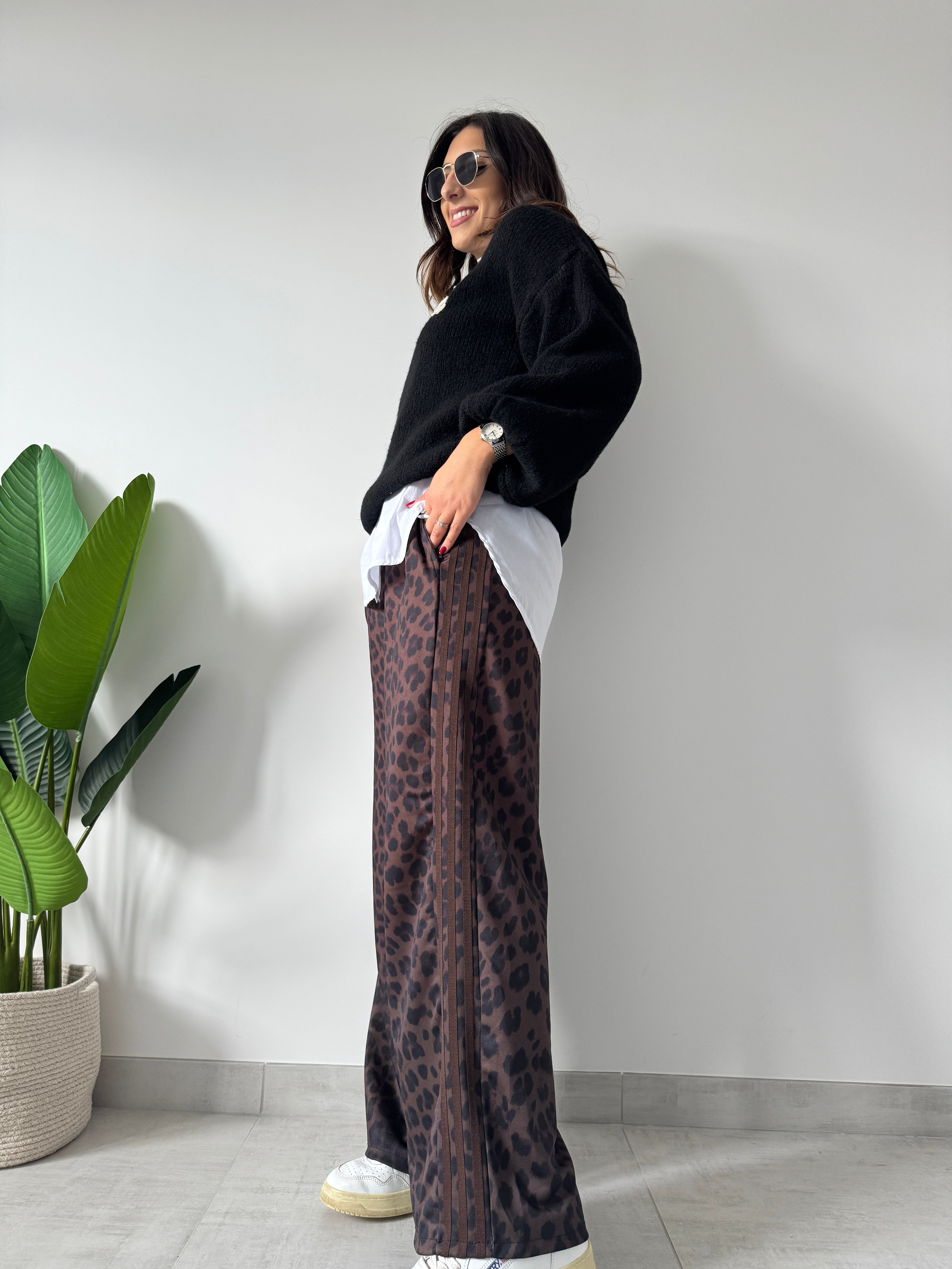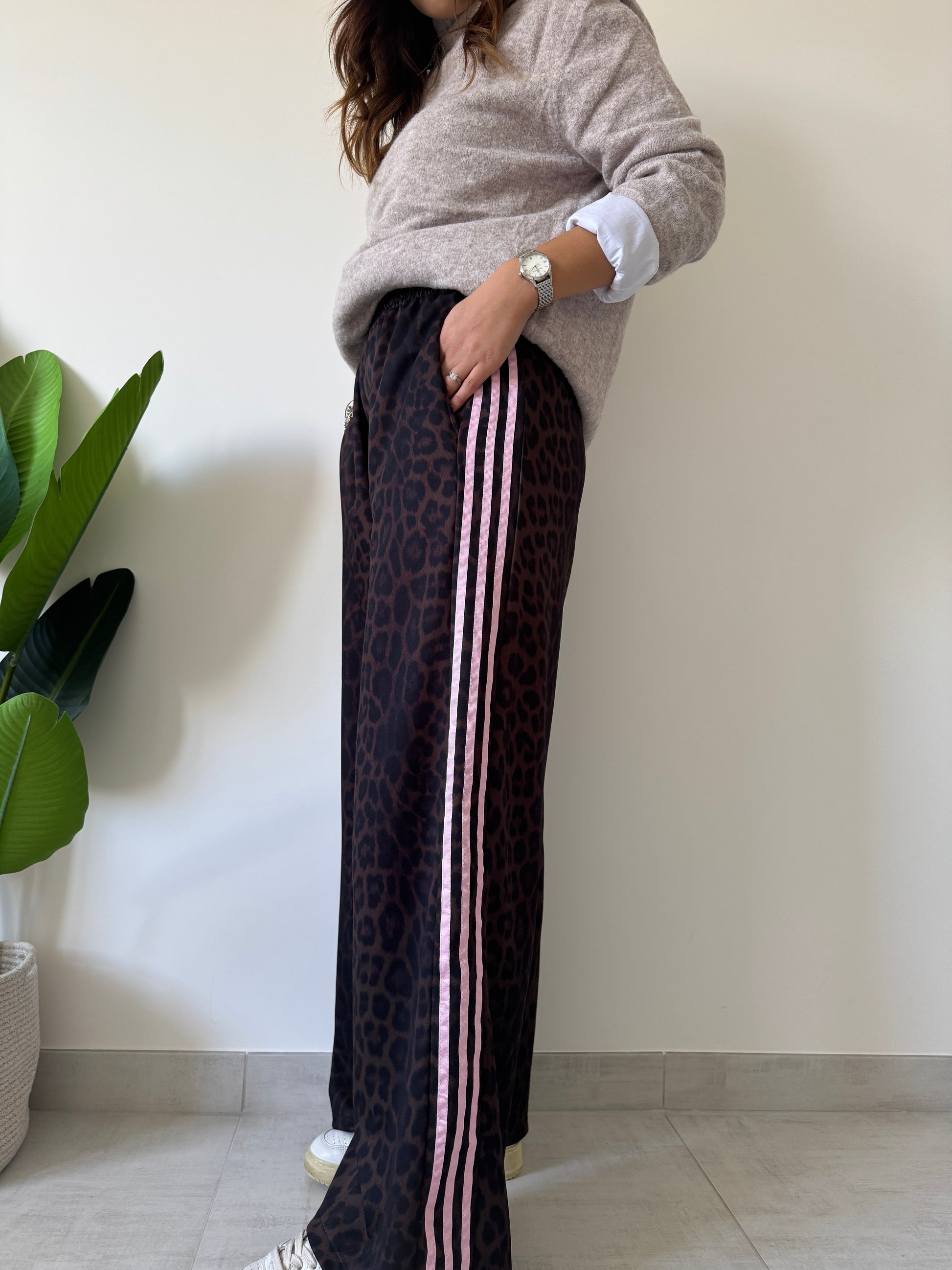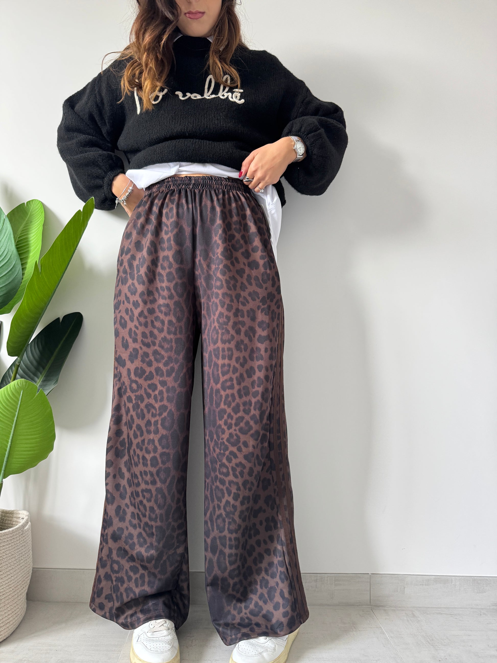 Pantalone palazzo con base maculata, elastico sul punto vita, tasche laterali e striscia lungo la gamba.