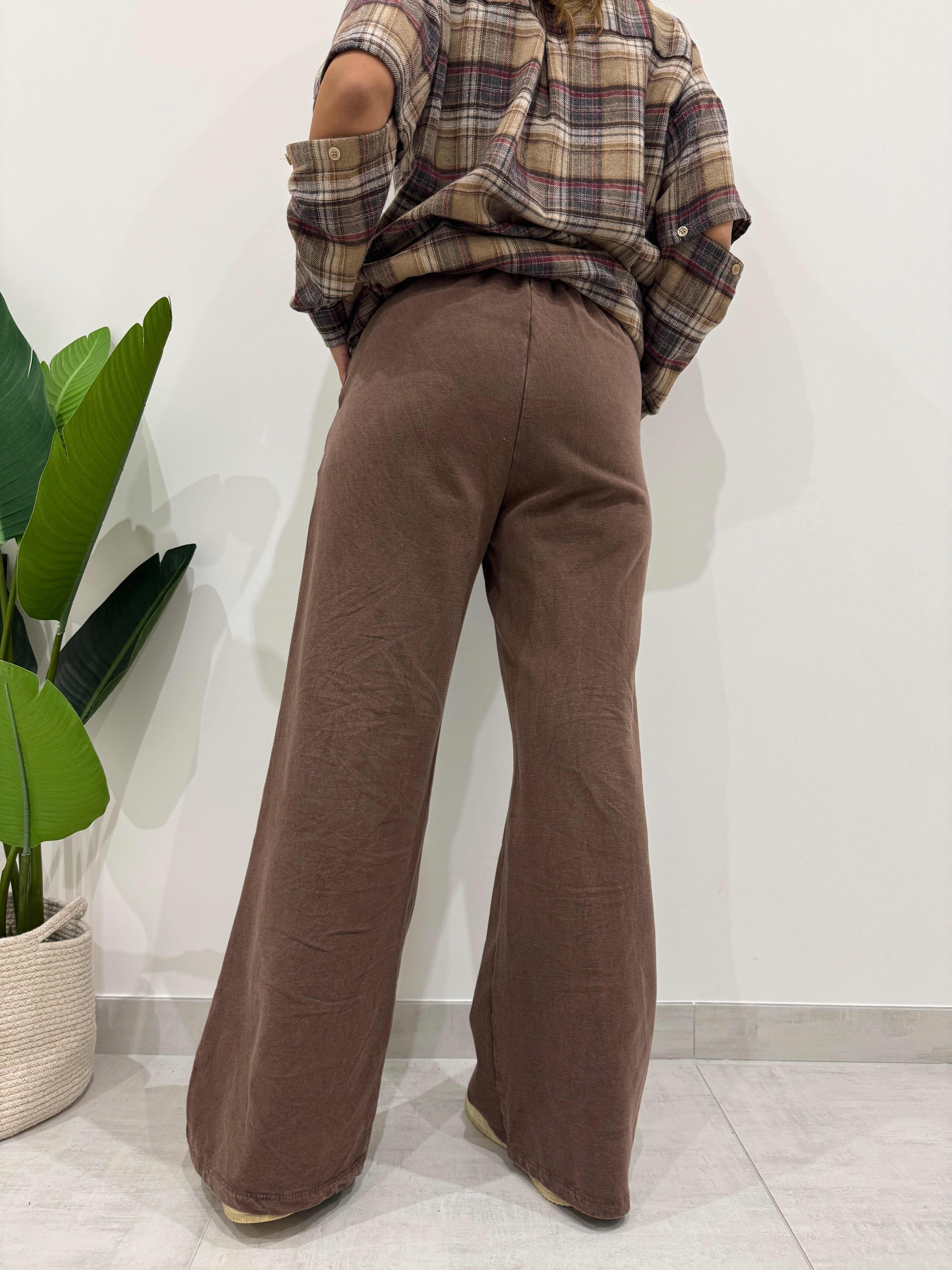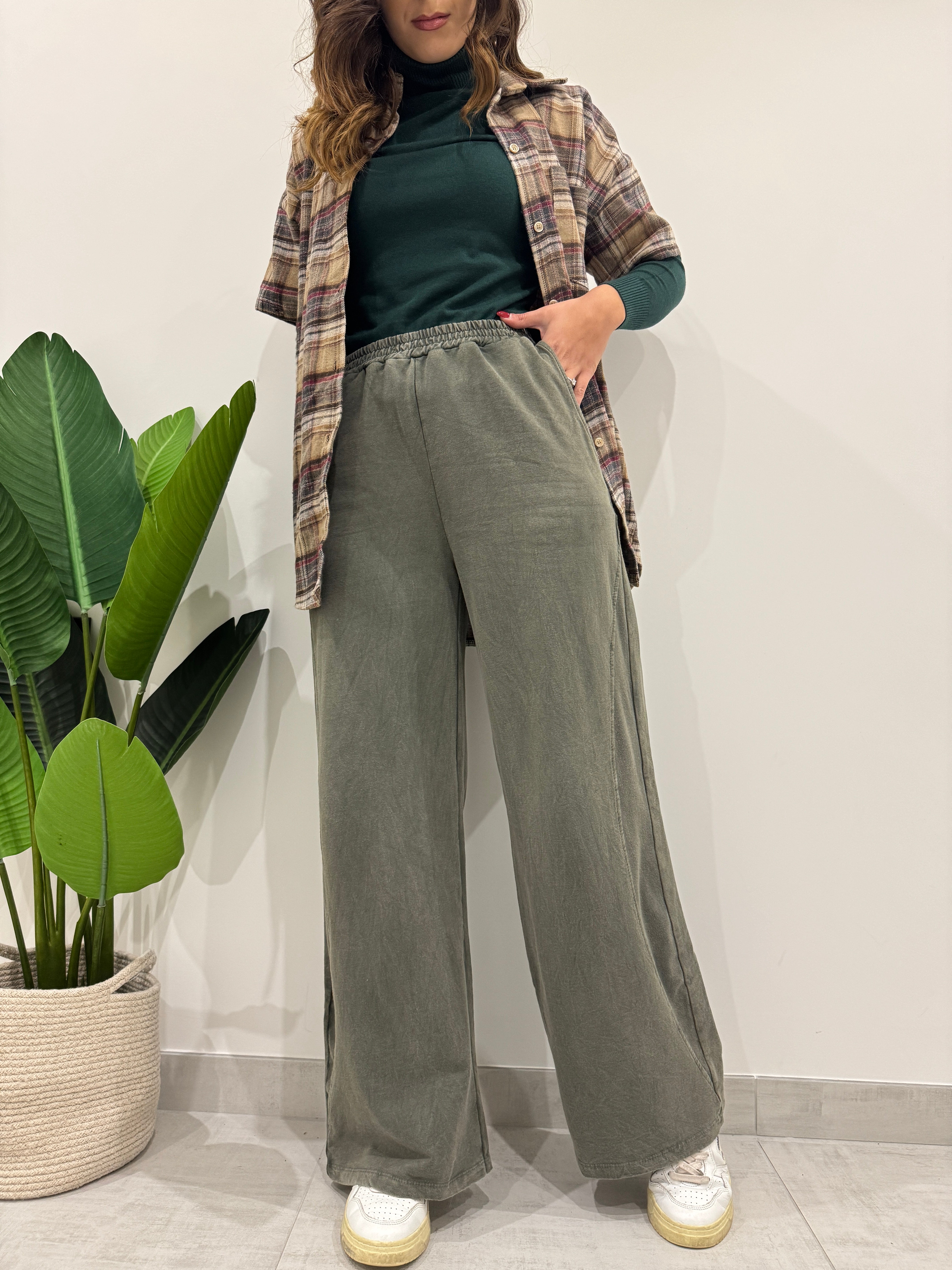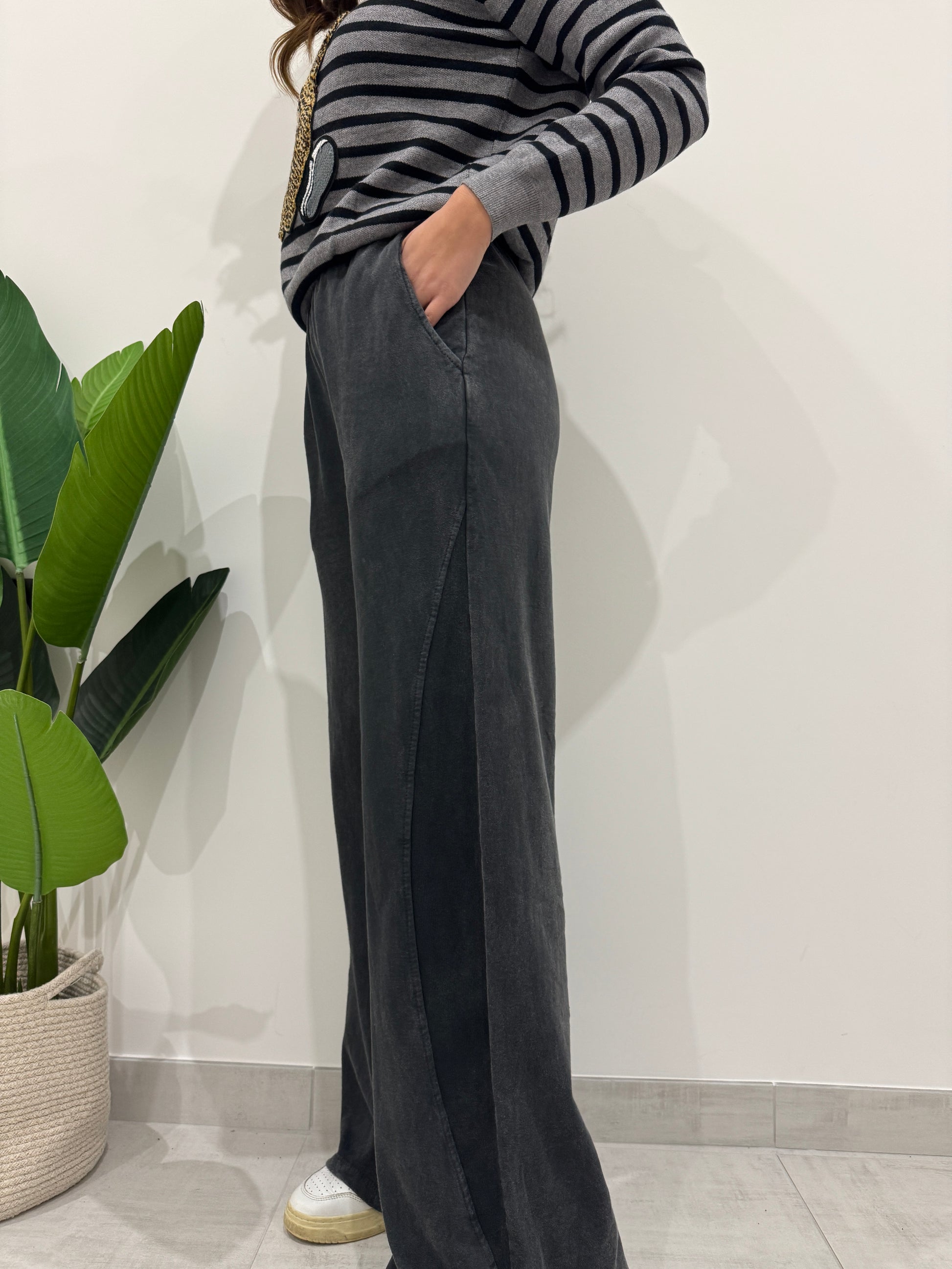 Pantalone marmorizzato firmato casa Susy Mix a palazzo con elastico sul punto vita, tasche laterali e dettaglio lungo la gamba.