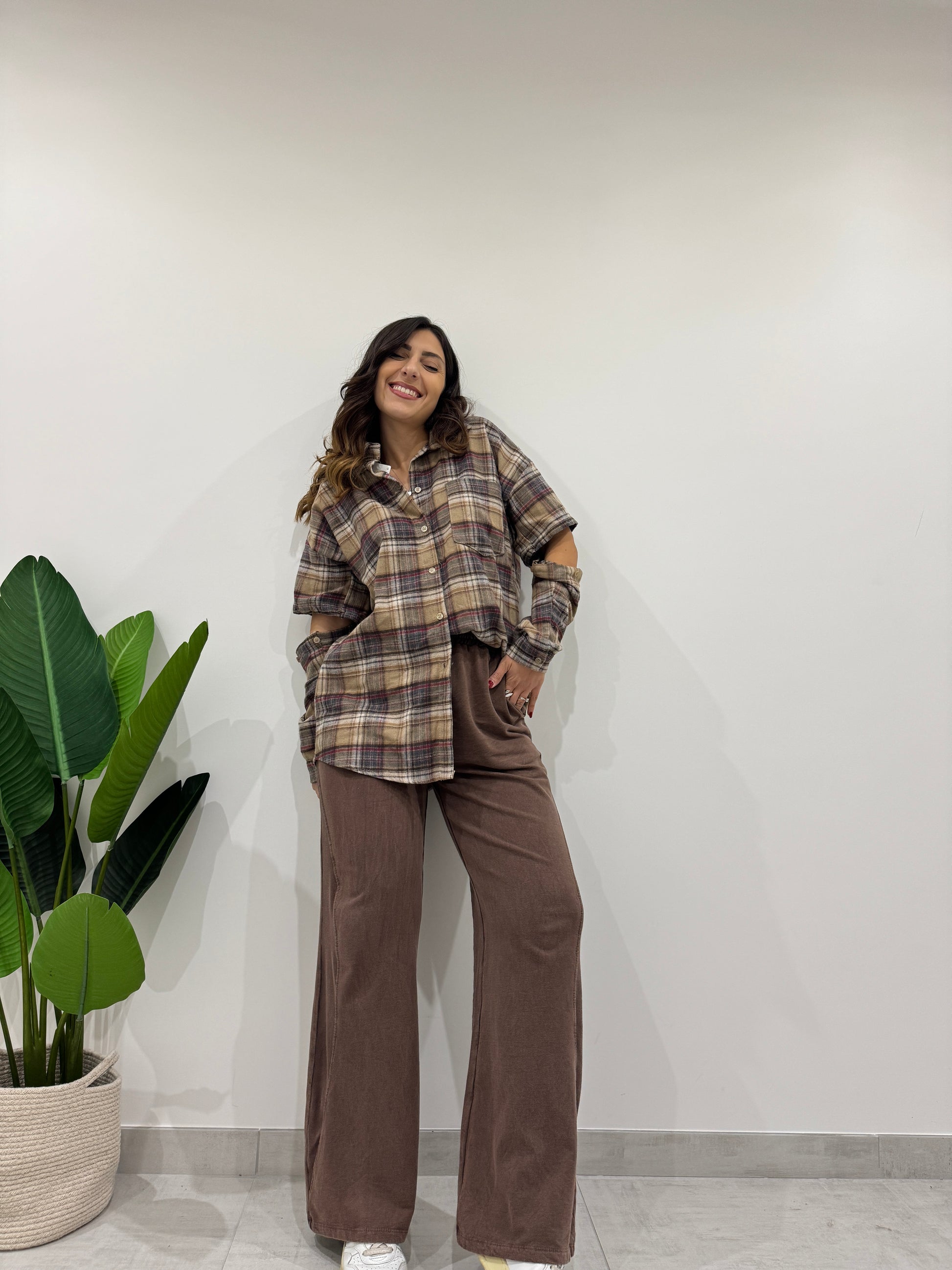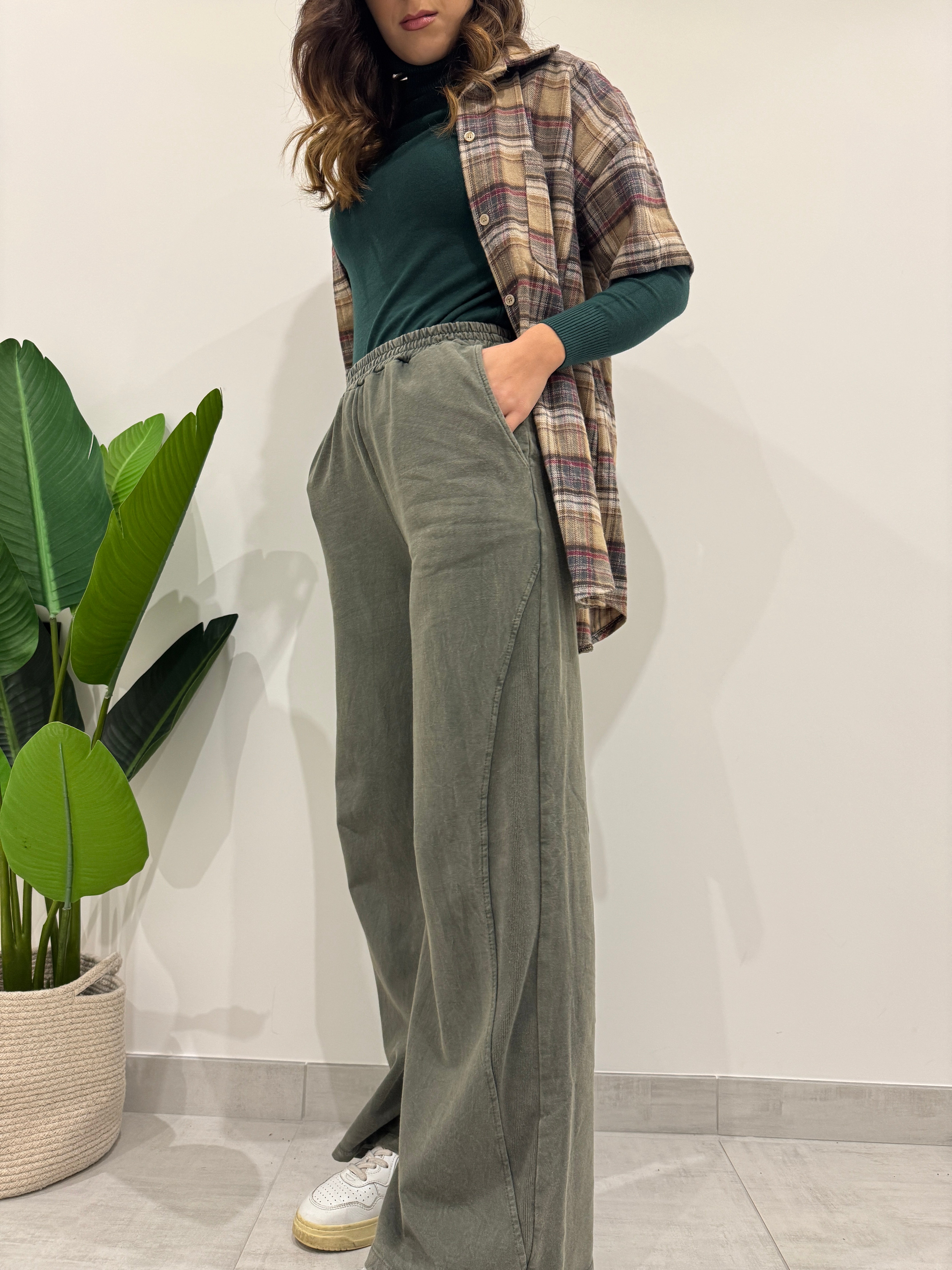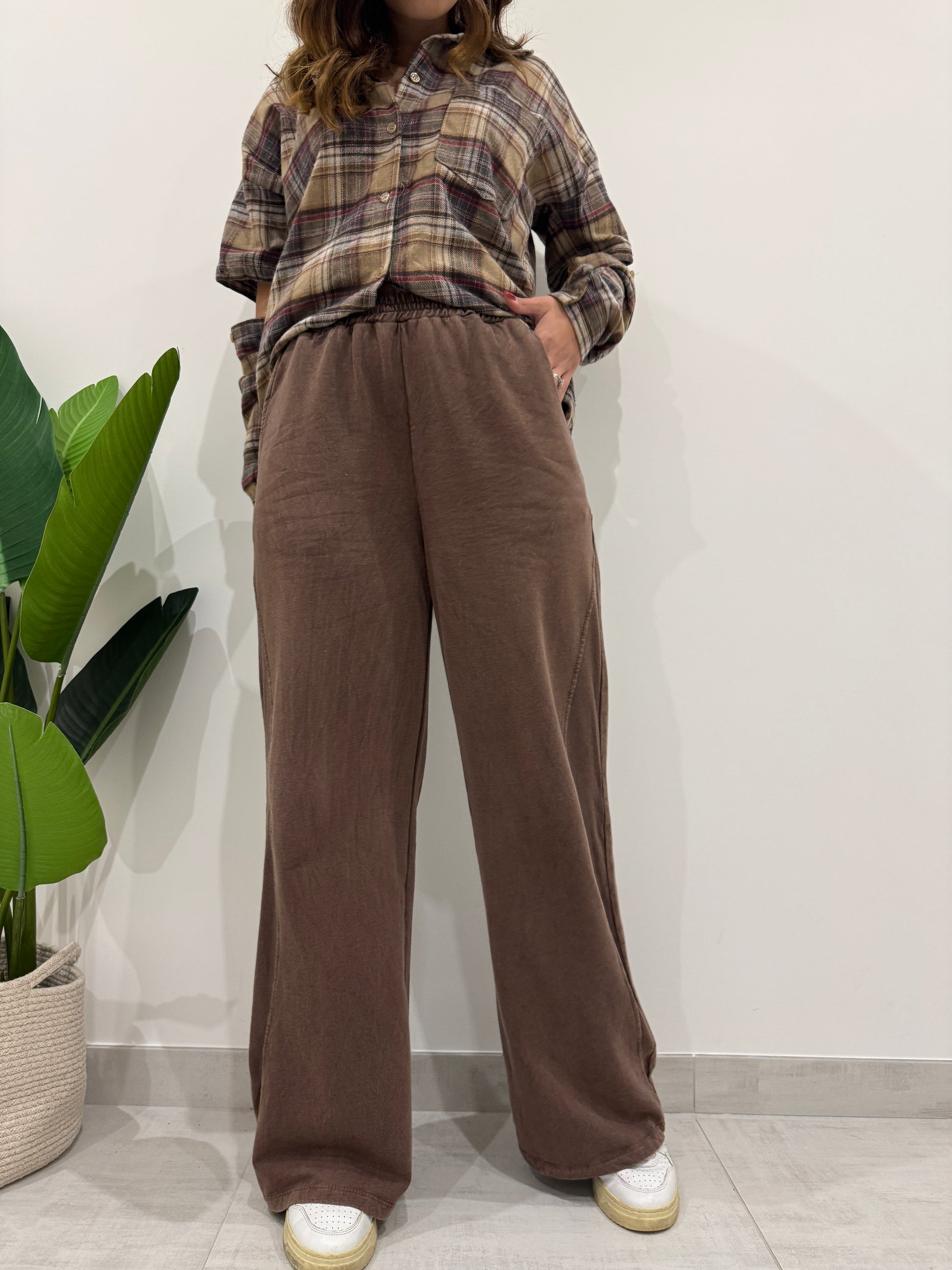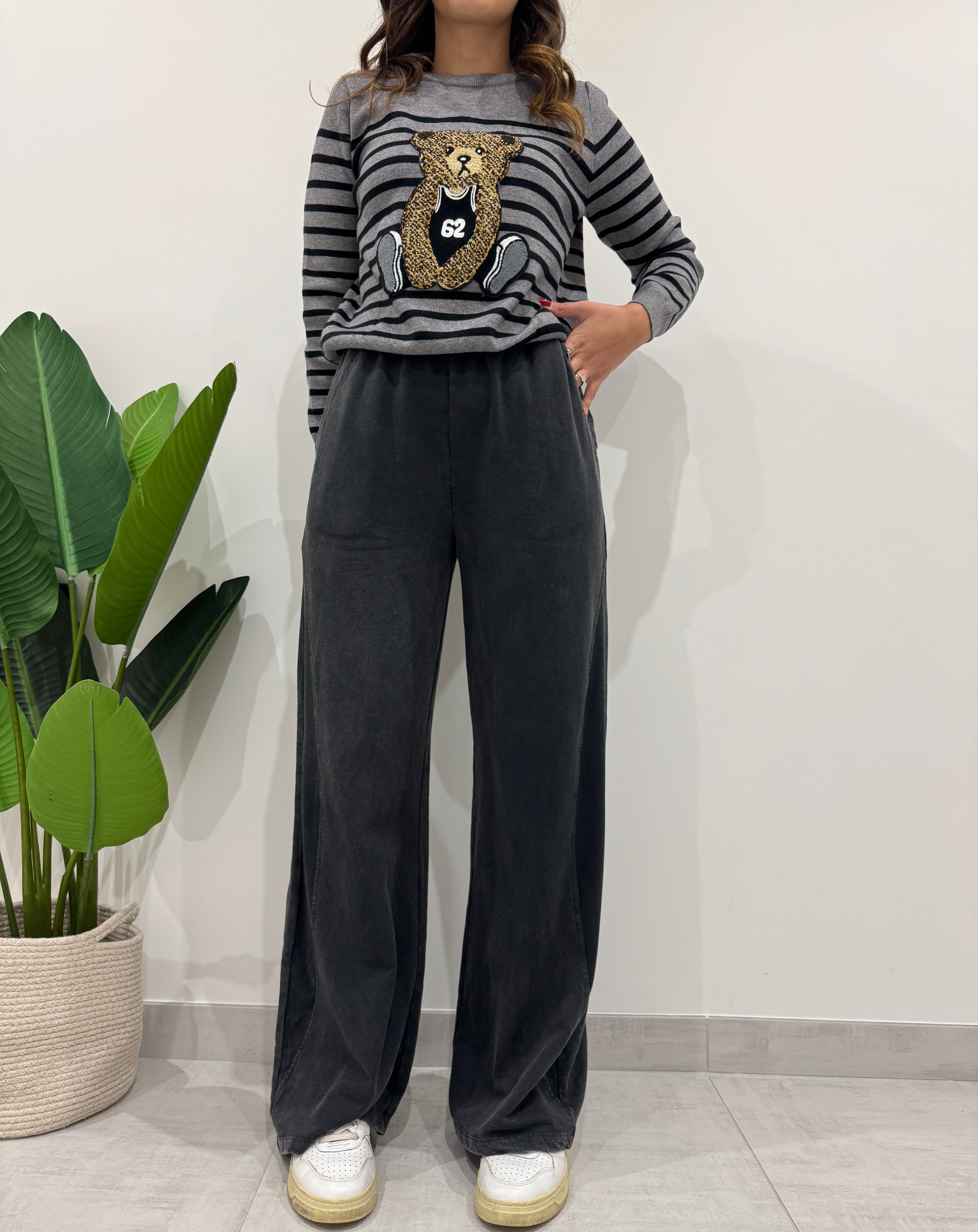 Pantalone marmorizzato firmato casa Susy Mix a palazzo con elastico sul punto vita, tasche laterali e dettaglio lungo la gamba.