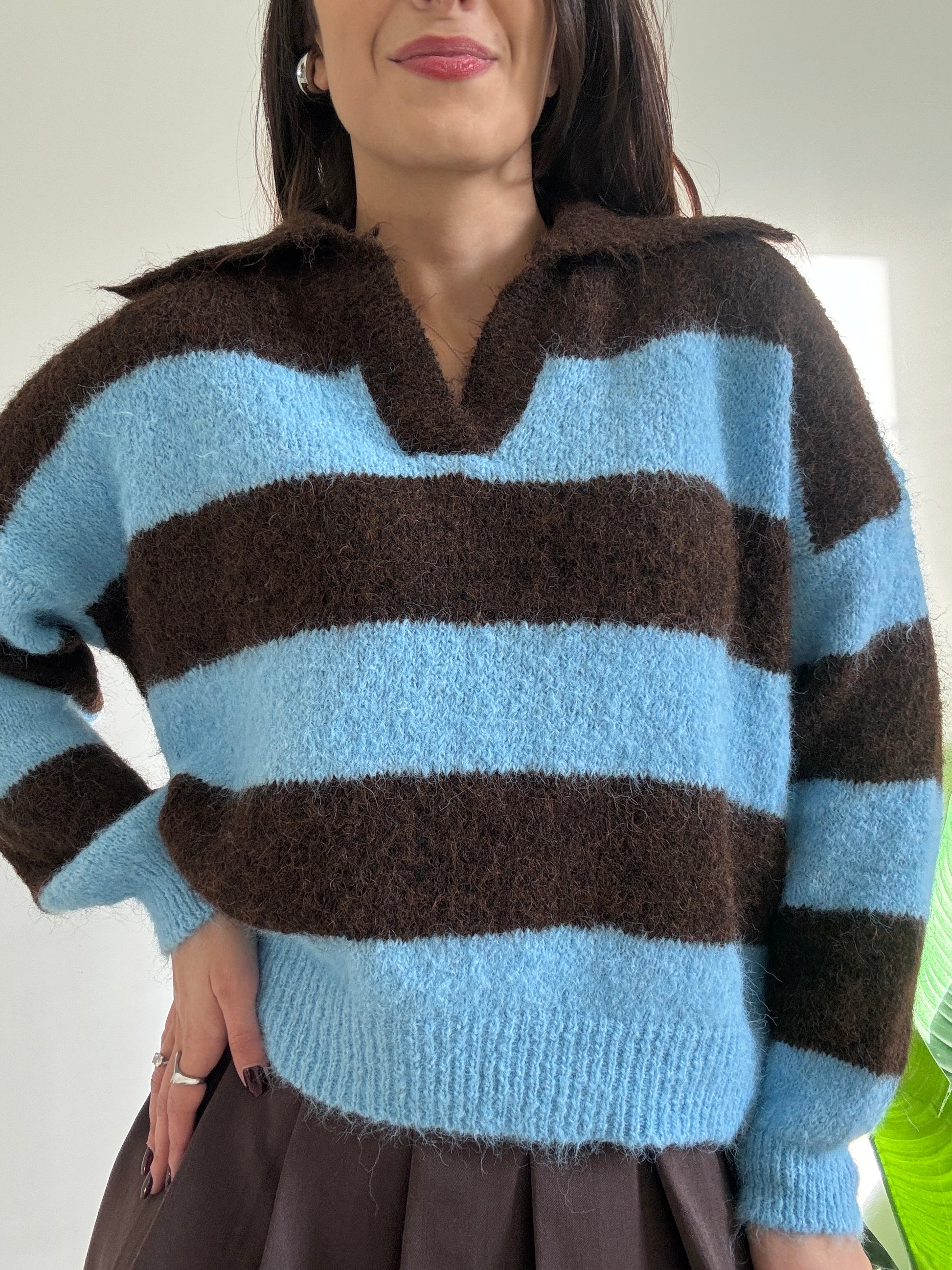 Pullover a righe con scollo a V, modello over con polsino.
