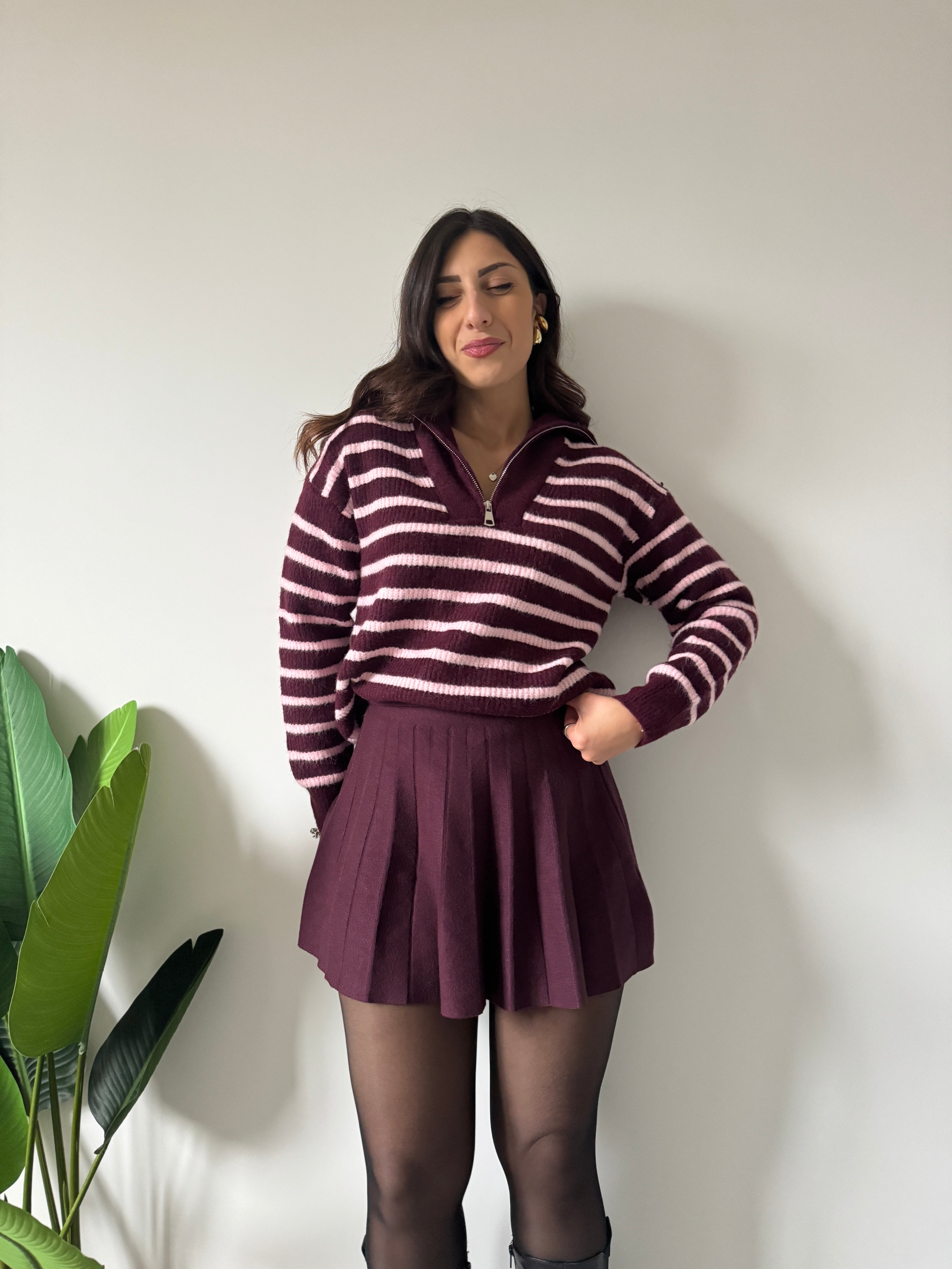 Pullover con collo alto, righe, polsini rifiniti e cerniera sul davanti. Unica variante colore.