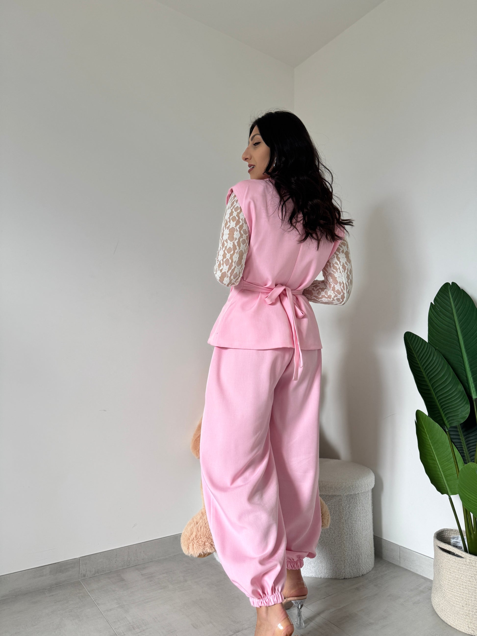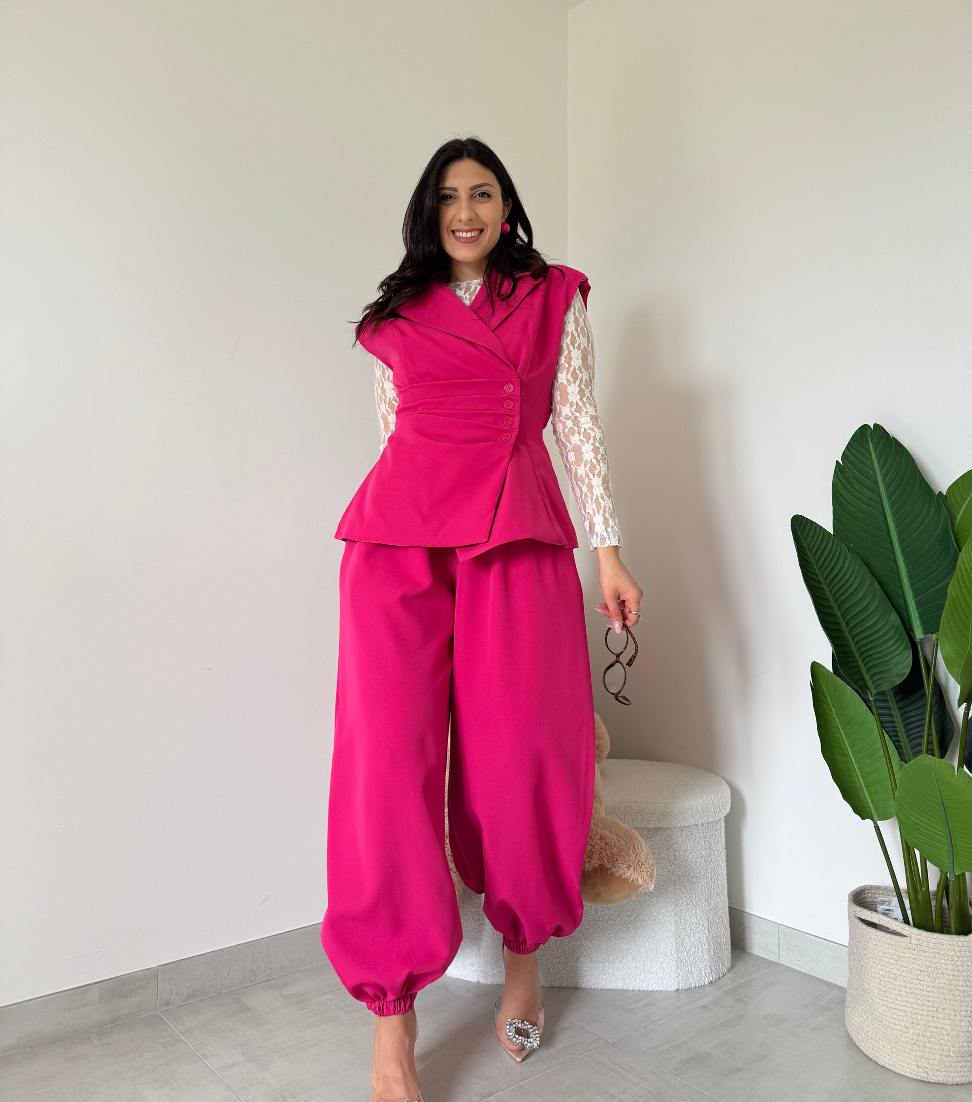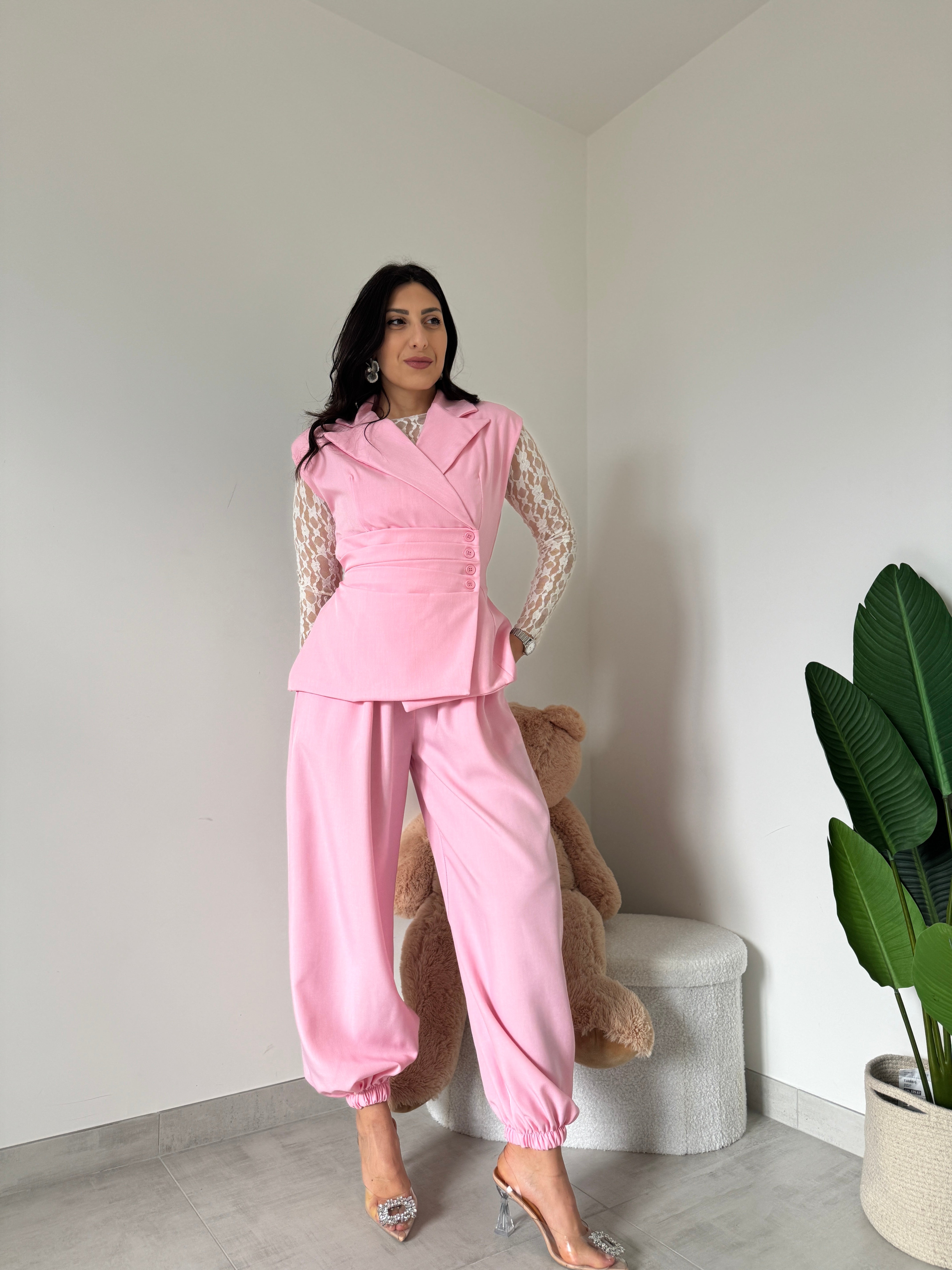 Tailleur composto da gilet con bottoni laterali, scollo ad incrocio e fiocco sul retro. Pantalone palloncino con elastico sul punto vita, tasche laterali ed elastico nella parte finale.