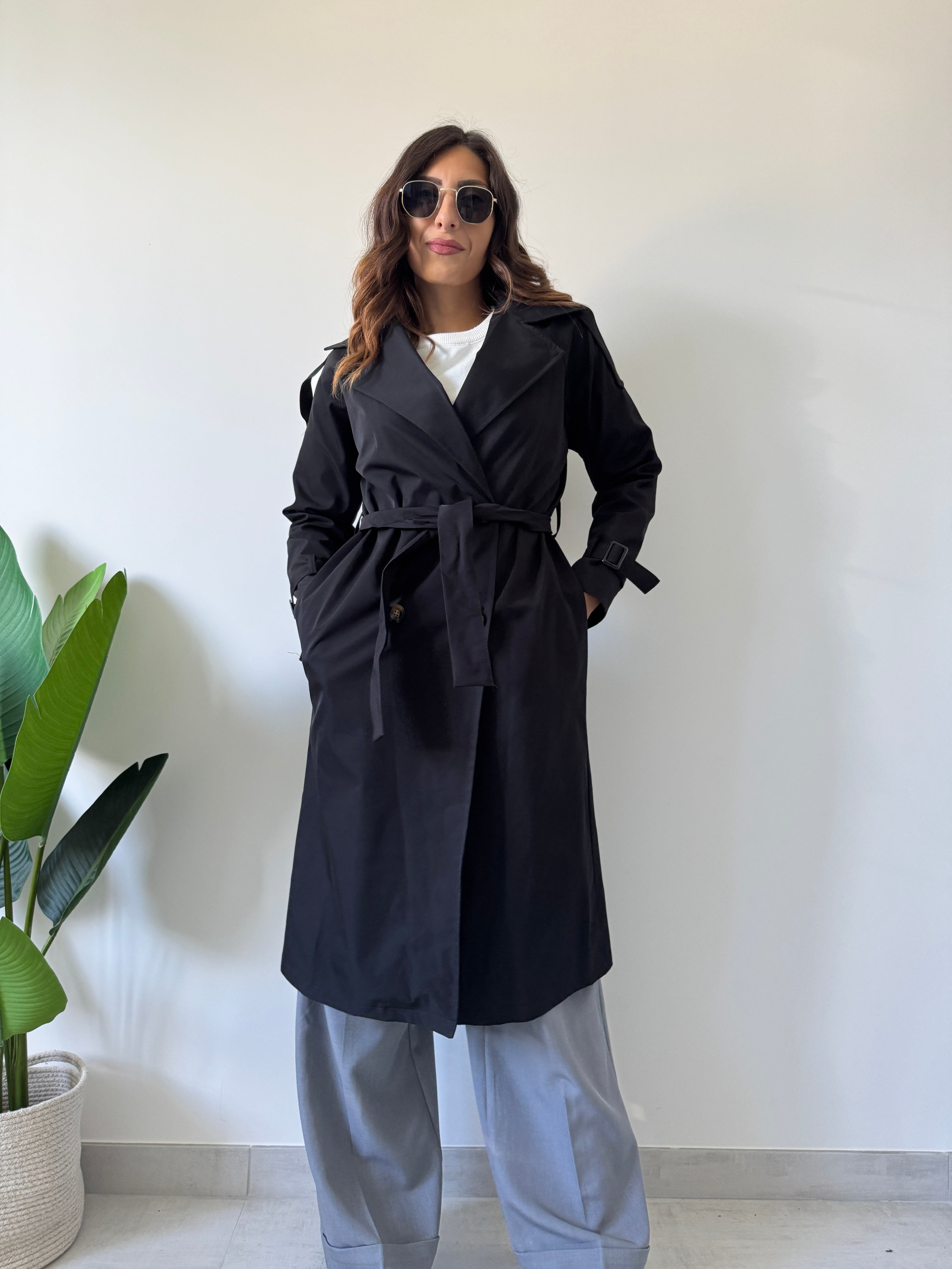 Trench con bottoni centrali di chiusura, polsini regolabili, tasche laterali e fusciacca sul punto vita. Variante colore nero.